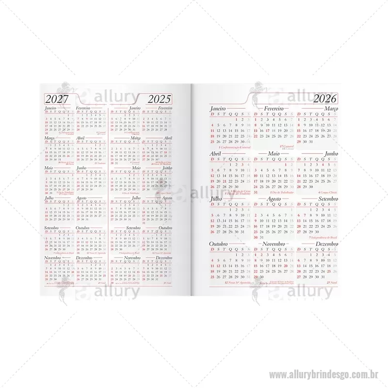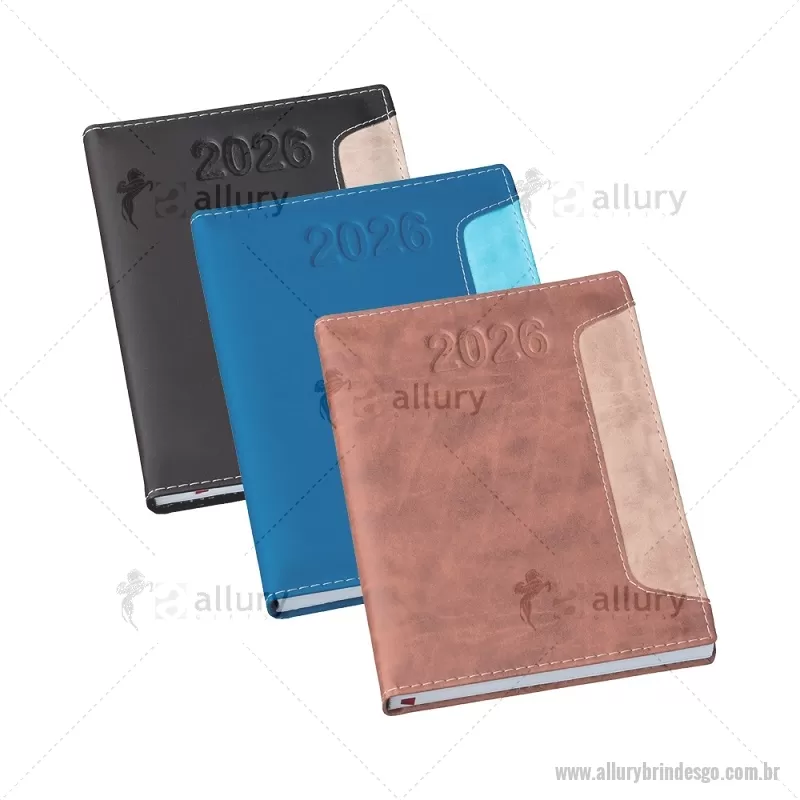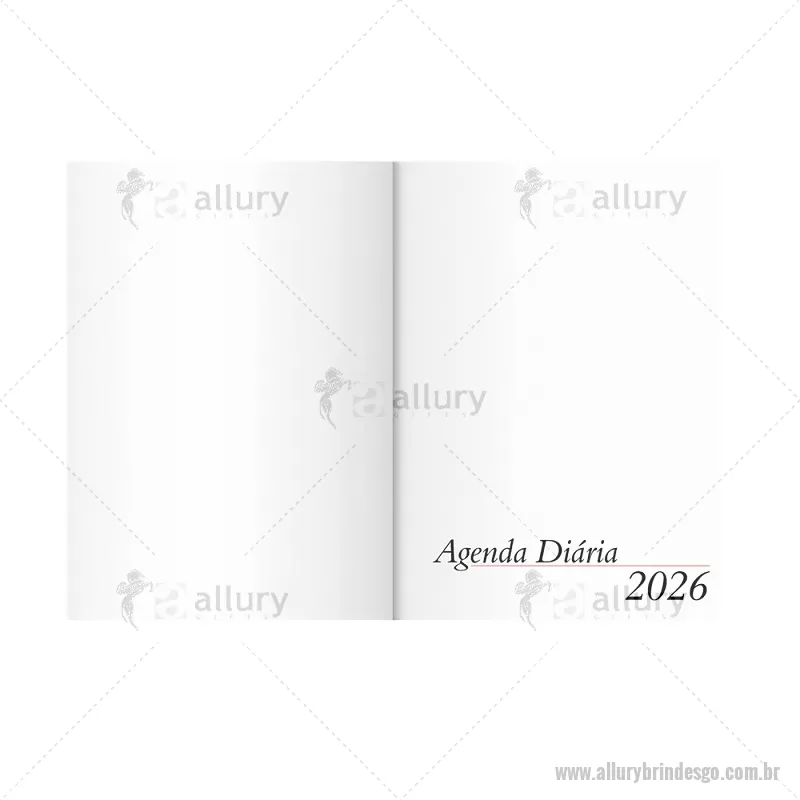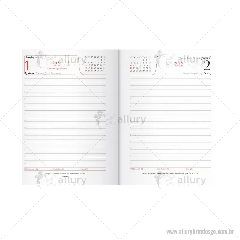 Agenda diária 2026 com capa em couro sintético e marcador de páginas em fita de cetim. Inclui seções para dados pessoais, calendários de 2025 a 2027, contatos, planejamento e mapas, ideal para organização completa do dia a dia. - - ALLGOAGE034