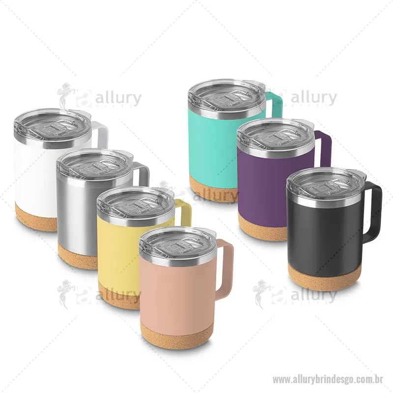 Caneca térmica em aço inox com parede dupla isolada à vácuo, tampa plástica e anel em silicone para vedação, alça lateral em inox na cor do produto, base em cortiça. Capacidade 350ml. - - ALLGOCAN076