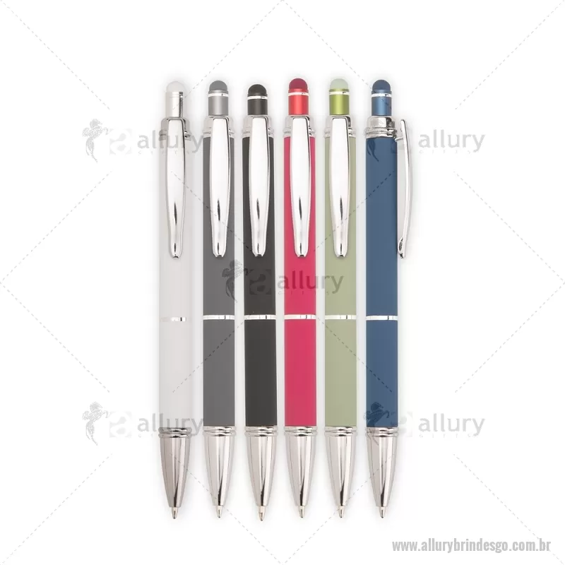 Caneta metálica com pintura de acabamento emborrachado. Possui acionamento por clique, topo emborrachado para uso em dispositivos com telas sensíveis ao toque e carga esferográfica azul de 1,0 mm. Altura : 14 cm x Largura : 1,6 cm Peso aproximado (g): 18 - - ALLGOCMT316