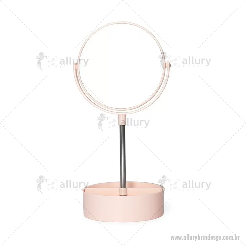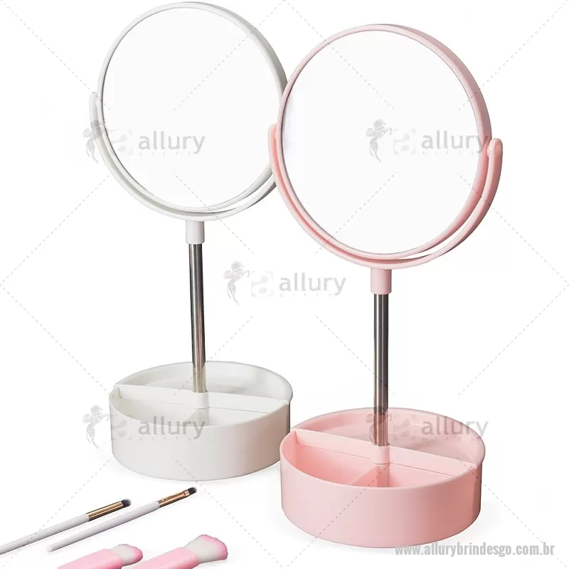 Espelho de Mesa Plástico Descrição: Espelho de mesa dupla face giratório com base e moldura feitas em plástico e pedestal de alumínio. Contém três divisórias na base para organizar de objetos diversos. Altura : 34,5 cm x Largura : 14,5 cm Peso aproximado (g): 275 - - ALLGOFEM121
