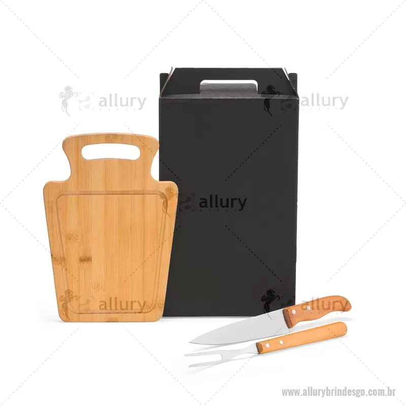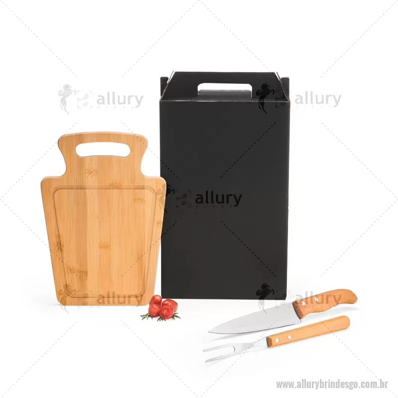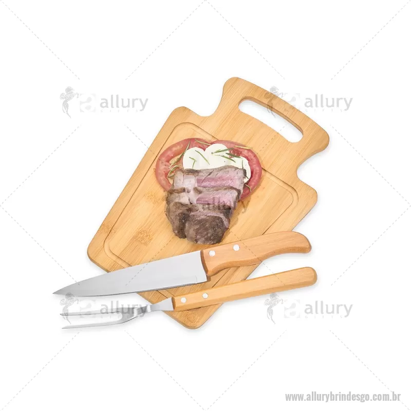 Conjunto Para Churrasco Em Bambu / Madeira / Inox - 3 Pçs Composto por tábua em Bambu com 30x21x1,2 cm; faca 7'' e garfo em Madeira/Inox. Dimensões do Produto Tábua: 30x21x1,3 cm Sugestão de Personalização Uma gravação a Laser na petisqueira e lâmina da faca; uma gravação em Silk/Digital na caixa. Embalagem : Caixa Preta 40x21,8x4,5 cm (AxLxP) Peso: 619 g (com embalagem) - - ALLGOKCH095