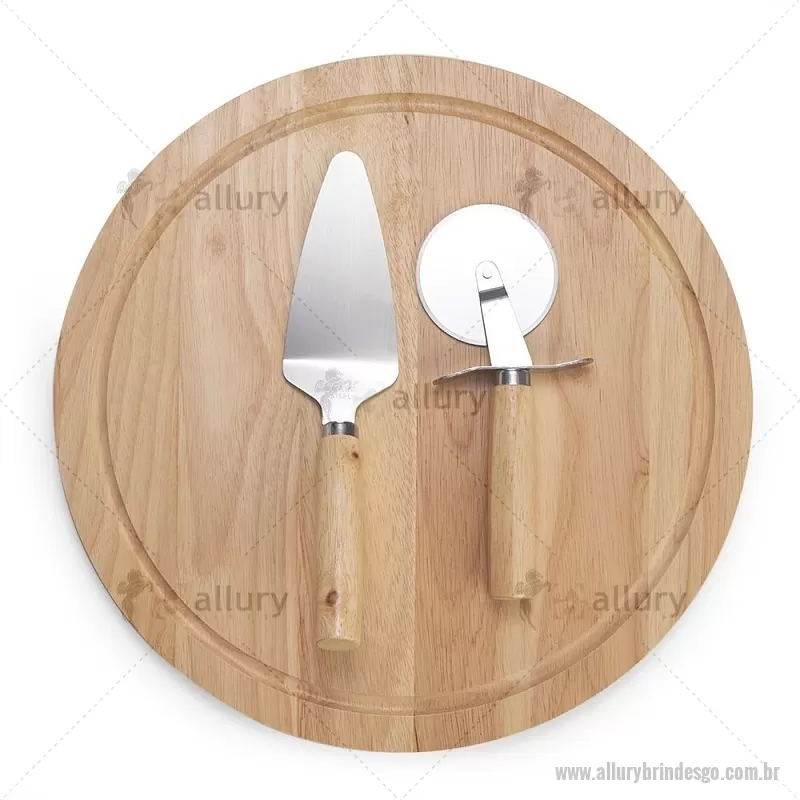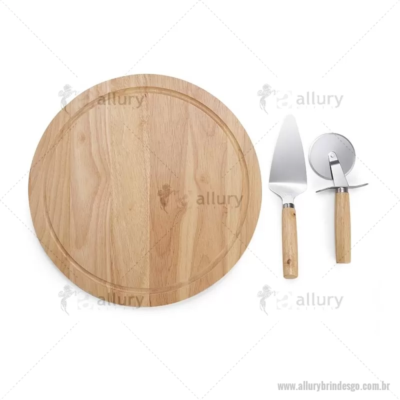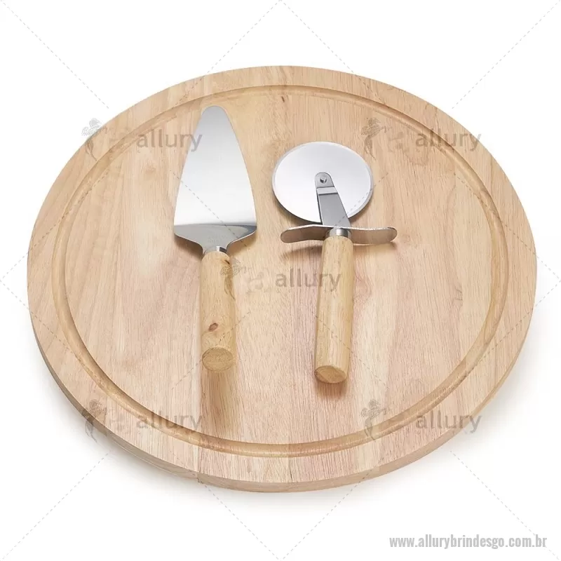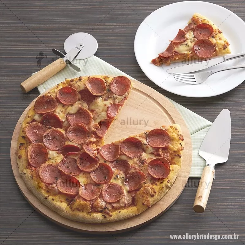 Kit pizza 3 peças, contém: tabua de bambu com canaleta, espátula de inox com cabo de bambu e cortador de pizza de inox com cabo de bambu. Altura : 32,4 cm x Largura : 32,4 cm x Espessura : 1,3 cm Peso aproximado (g): 887 Gravação em Laser. - - ALLGOKPZ004