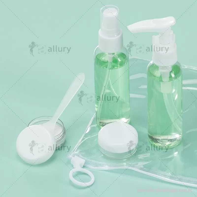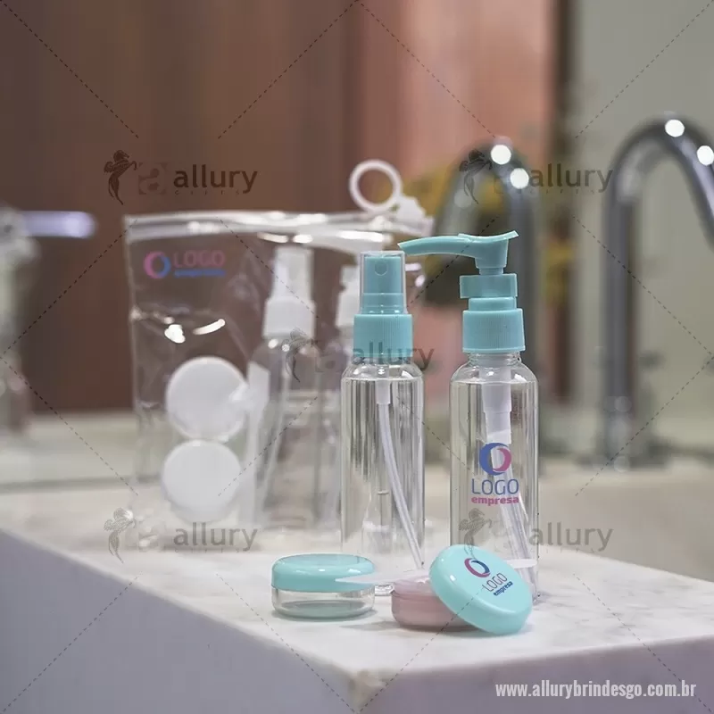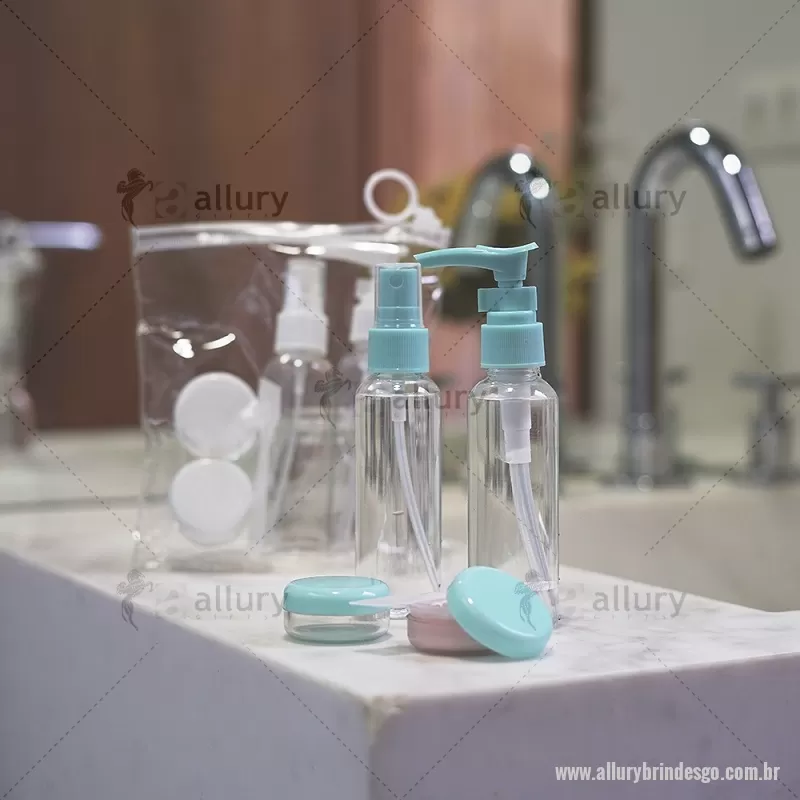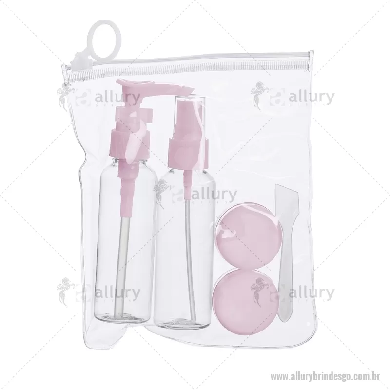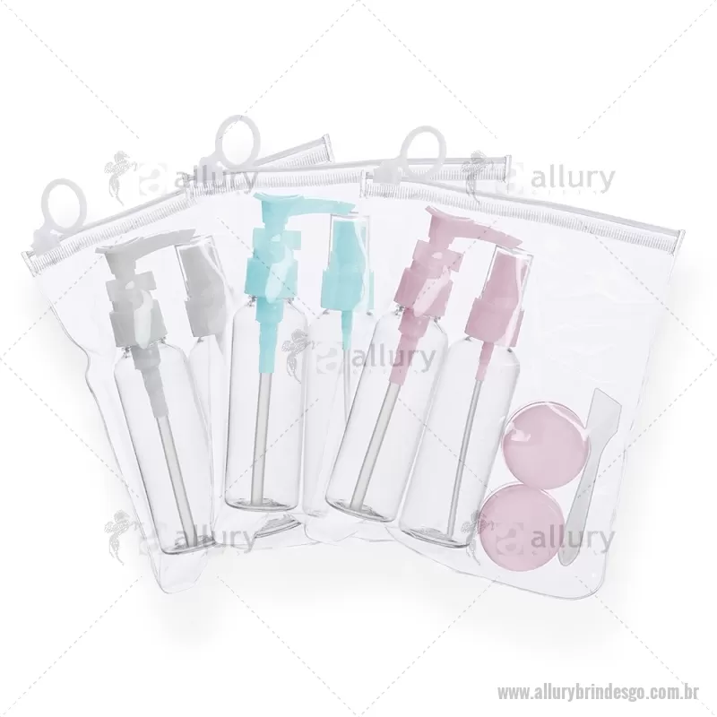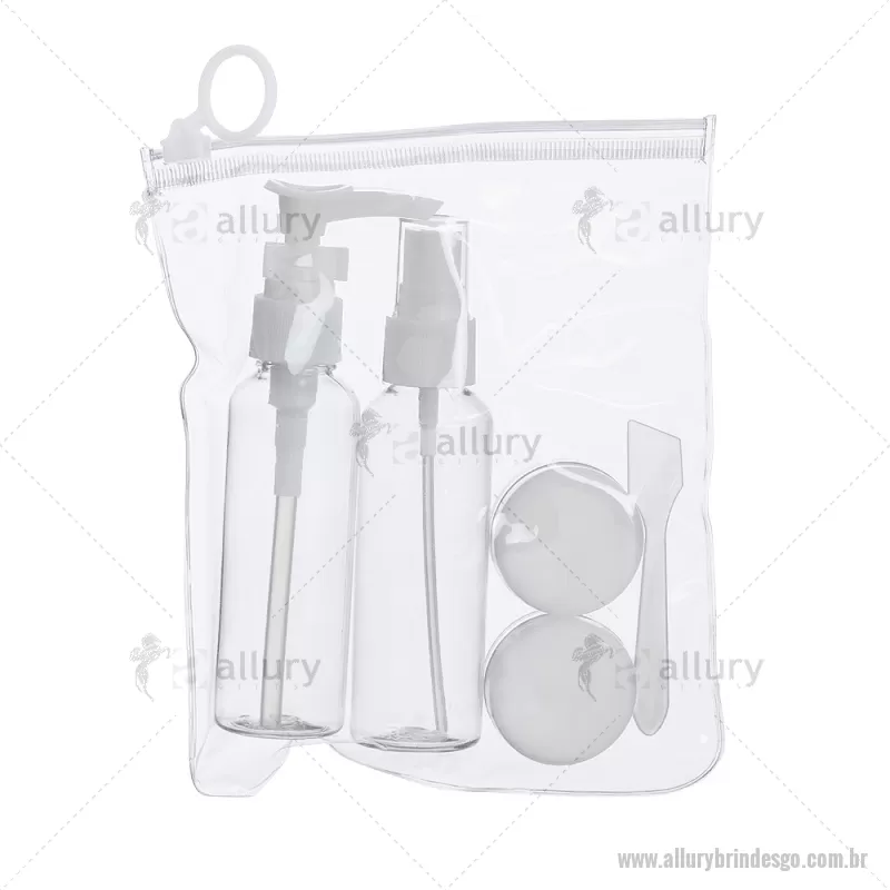 Kit Viagem 5 Peças Descrição: Kit viagem 5 peças em estojo ziplock. Contém frasco de 70ml com tampa spray; frasco de 70 ml com tampa pump; 2 potes de 10ml com tampa rosqueável e mini espátula fosca. Frascos plásticos e estojo em pvc com puxador plástico. Altura : 17,2 cm x Largura : 14,5 cm Peso aproximado (g): 61 - - ALLGOKVG017