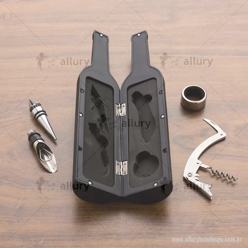 Kit vinho formato garrafa com 4 peças: tampa de bico, bico condutor com tampa, saca rolhas metálico com lâmina de corte e abridor de garrafa e wine collar. Estojo com fechamento imantado e área interna com berço de espuma. Altura : 32,4 cm x Largura : 7,2 cm Peso aproximado (g): 352 - - ALLGOKVI043