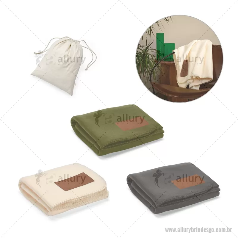 Manta em tecido polar, 100% poliéster reciclado (100% rPET), com área para personalização em microfibra. Fornecido em saco de tecidos 100% reciclado (70% algodão reciclado e 30% poliéster reciclado), com gramagem de 140 g/m². Medidas: 1600 x 1200 mm | Saco: 400 x 320 mm Peso do Produto (g.): 620 - - ALLGOMAT007