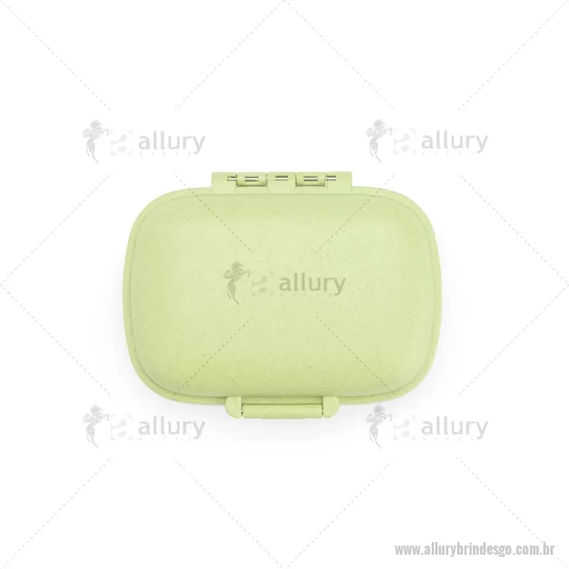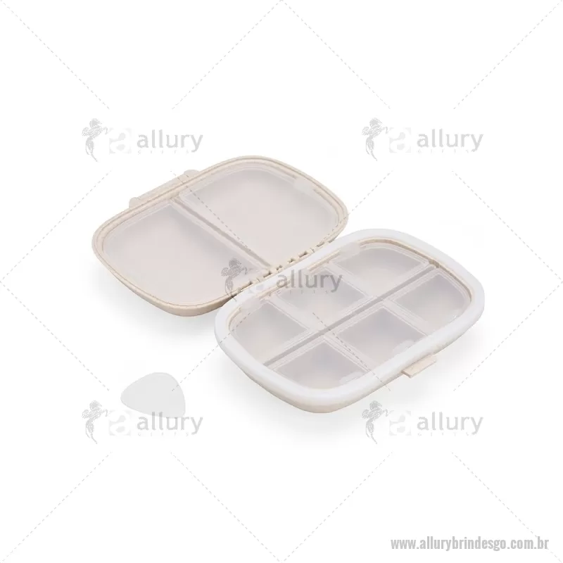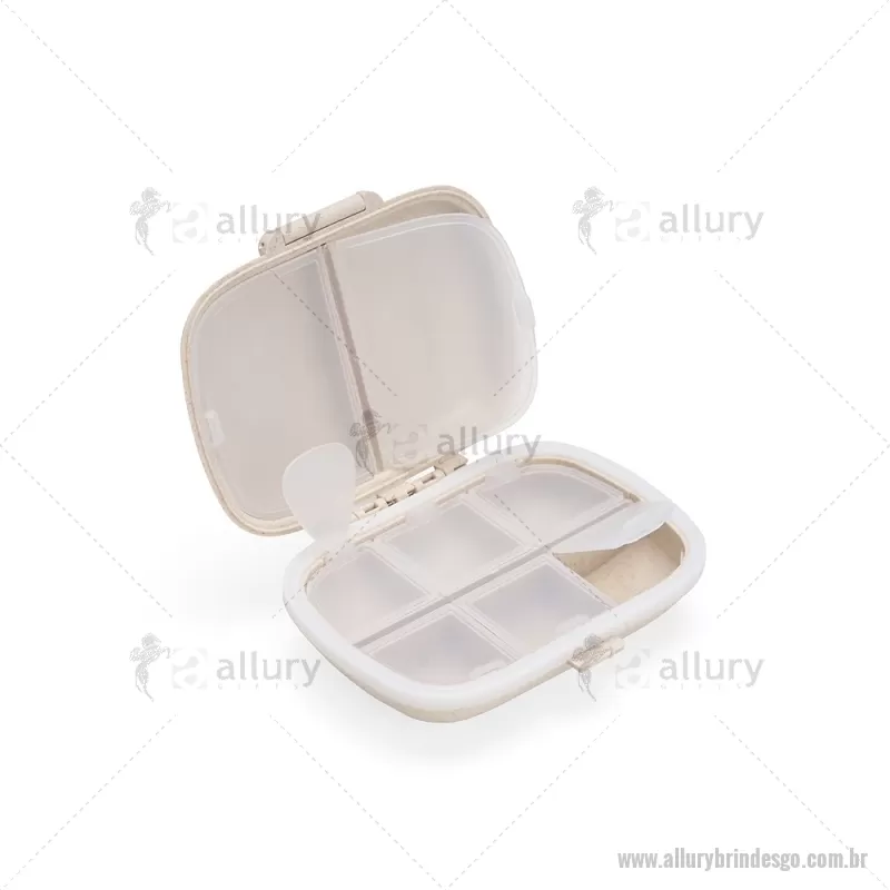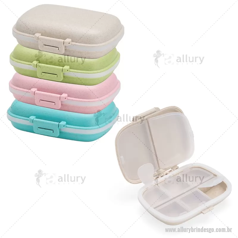 Porta-Comprimidos Plástico Porta-comprimidos compacto feito em plástico obtido da palha de trigo e anel de vedação para as bordas em silicone. Possui oito compartimentos com tampas removíveis, sendo dois maiores com capacidade de até 30ml e seis menores com até 10ml cada. Acompanha palheta multiuso. Largura : 8,6 cm x Espessura : 3,6 cm x Comprimento : 11 cm Peso aproximado (g): 72 - - ALLGOPCP016