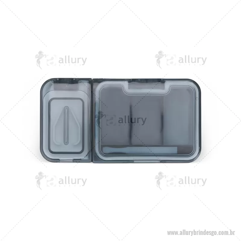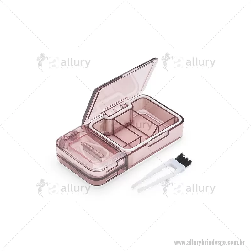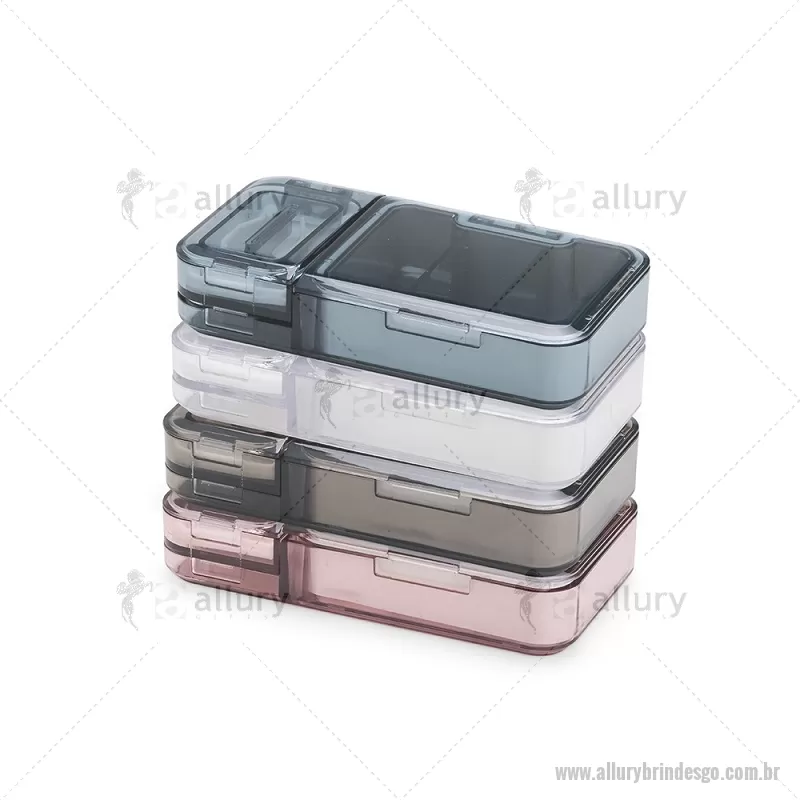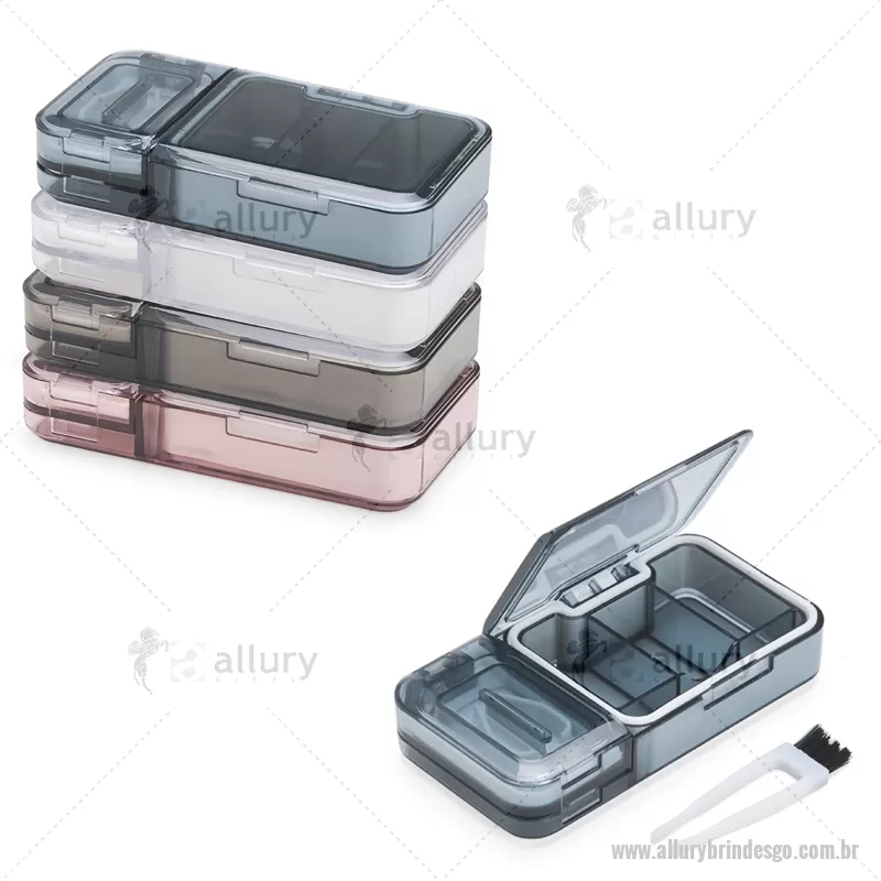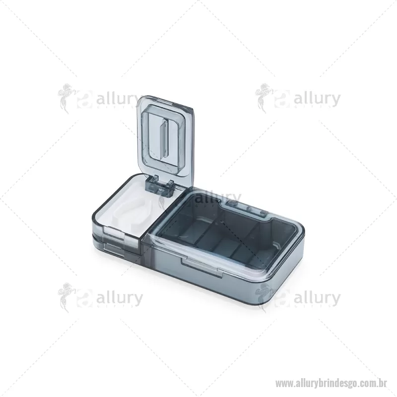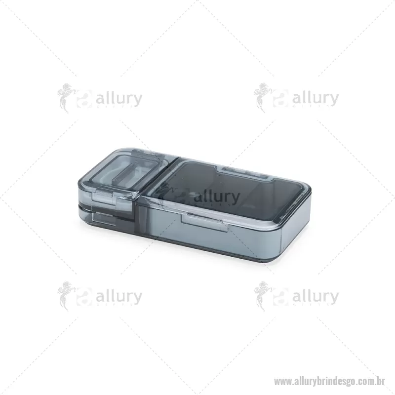 Porta Comprimidos Plástico Descrição: Porta-comprimidos multifuncional em plástico. Possui três divisórias com capacidade de até 10ml cada, além de dois compartimentos especiais: um cortador de comprimidos na parte superior e outro para trituração, localizado na parte inferior. Largura : 6 cm x Espessura : 2,5 cm x Comprimento : 12 cm Peso aproximado (g): 107 - - ALLGOPCP017