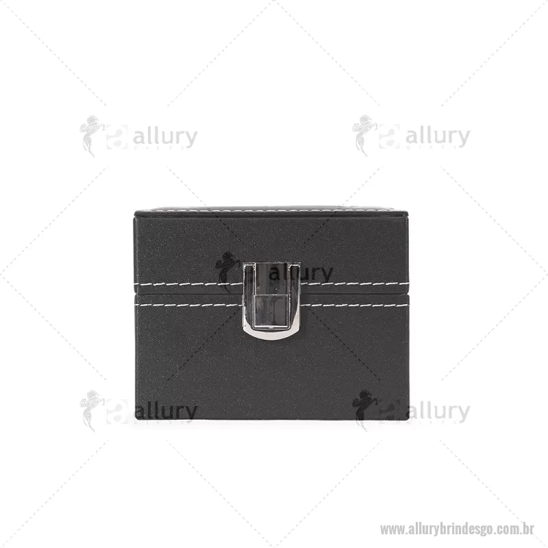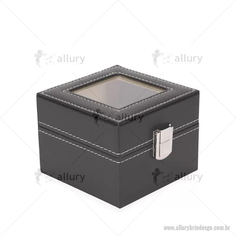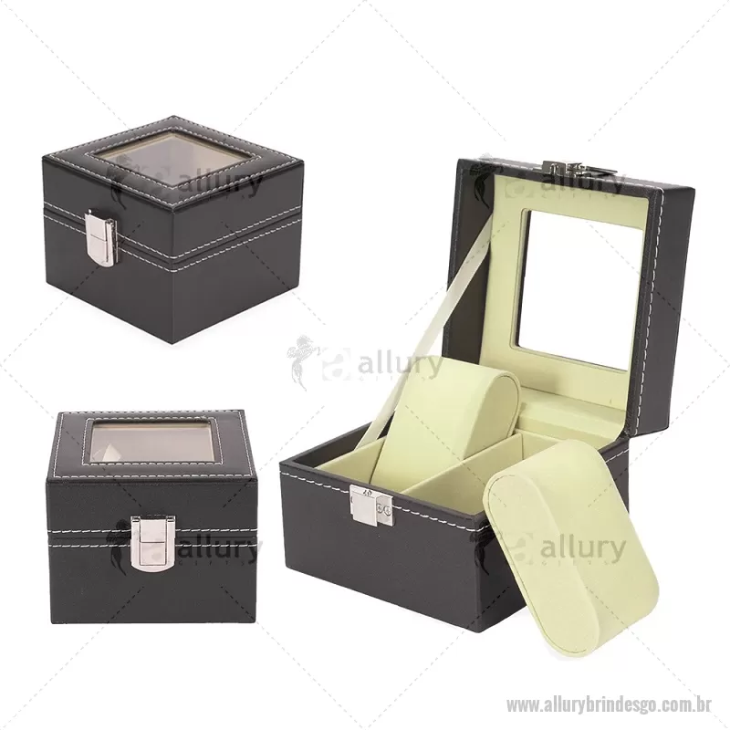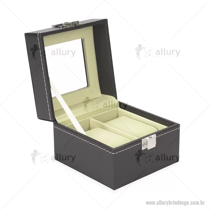 Porta relógios com acabamento externo em couro sintético à base de PVC e interior revestido em veludo macio. Possui duas divisórias com almofadas removíveis para melhor acomodação das peças, tampa com visor em vidro que facilita a visualização e trava de segurança que garante o fechamento adequado do estojo. Ideal para organizar e proteger relógios com elegância. - - ALLGOPREL001