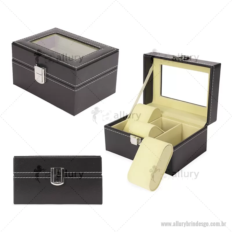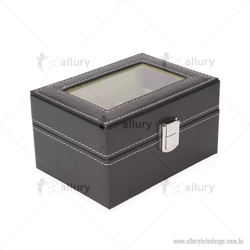 Estojo porta relógios com acabamento externo em couro sintético à base de PVC e interior revestido em veludo macio. Possui duas divisórias com almofadas removíveis para acomodar os relógios, tampa com visor de vidro e fecho com trava de segurança, garantindo proteção e organização com elegância. - - ALLGOPREL002