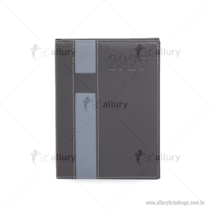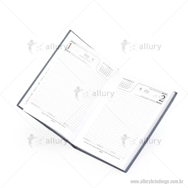 Agenda diária 2025 de couro sintético com suporte para caneta. Contém fita de cetim marca página, dados pessoais, calendário de 2024 à 2026, mapa do Brasil, mapa-múndi, índice telefônico e planejamento. Altura : 20 cm x Largura : 14,7 cm x Espessura : 2 cm Peso aproximado (g): 385 - - ALLGOAGE008