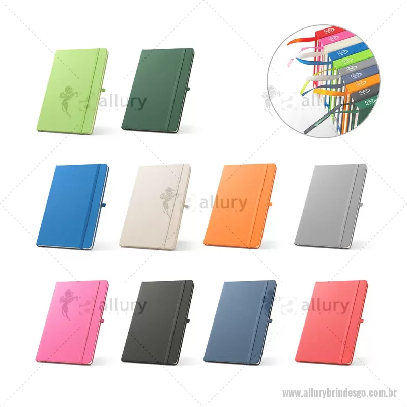 Caderno A5 de capa dura em poliéster 100% reciclado (100% rPET) com cantos redondos. Contém 80 folhas pautadas em papel cor de marfim reciclado, fita separadora, suporte para esferográfica (não inclusa) e elástico para fecho do caderno. Na parte inferior da lombada, tem impresso em branco o símbolo do rPET. 14,3 x 21,1 cm - - ALLGOBLC237