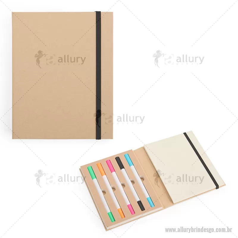 Bloco de anotações com capa dura em kraft e fechamento por elástico. Possui aproximadamente 80 folhas de tonalidade marfim sem pautas e cinco canetas coloridas de ponta dupla: uma fina e outra tipo pincel. Largura : 14,3 cm x Espessura : 2,3 cm x Comprimento : 18,1 cm Tamanho total aproximado (CxL): Caneta: 16,1 cm x 1 cm Peso aproximado (g): 247 - - ALLGOBLC280