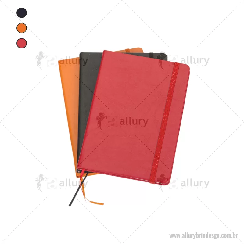 Bloco de Anotações confeccionado em couro sintético com textura suave, capa com cantos arredondados, marca página, elástico p/ fechamento e 80 folhas pautada. Gravação em Silk Screen. Ideal para brindes personalizados, eventos corporativos e ações promocionais. - - ALLGOBLC014