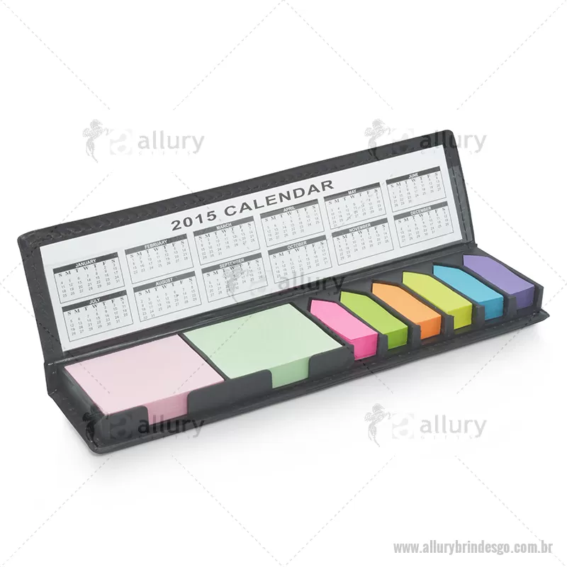 Bloco de anotações em couro sintético com 2 bloquinhos recados, 6 post-its coloridos com aproximadamente 90 folhas cada e calendário 2015 e 2016. Ótima opção para brindes personalizados, eventos corporativos e ações promocionais. - - ALLGOBLC067