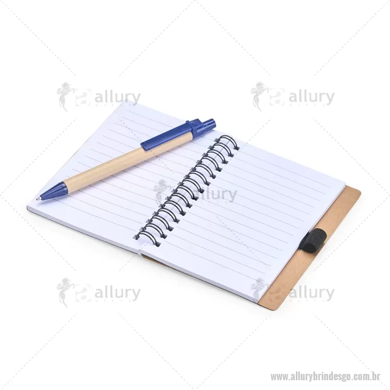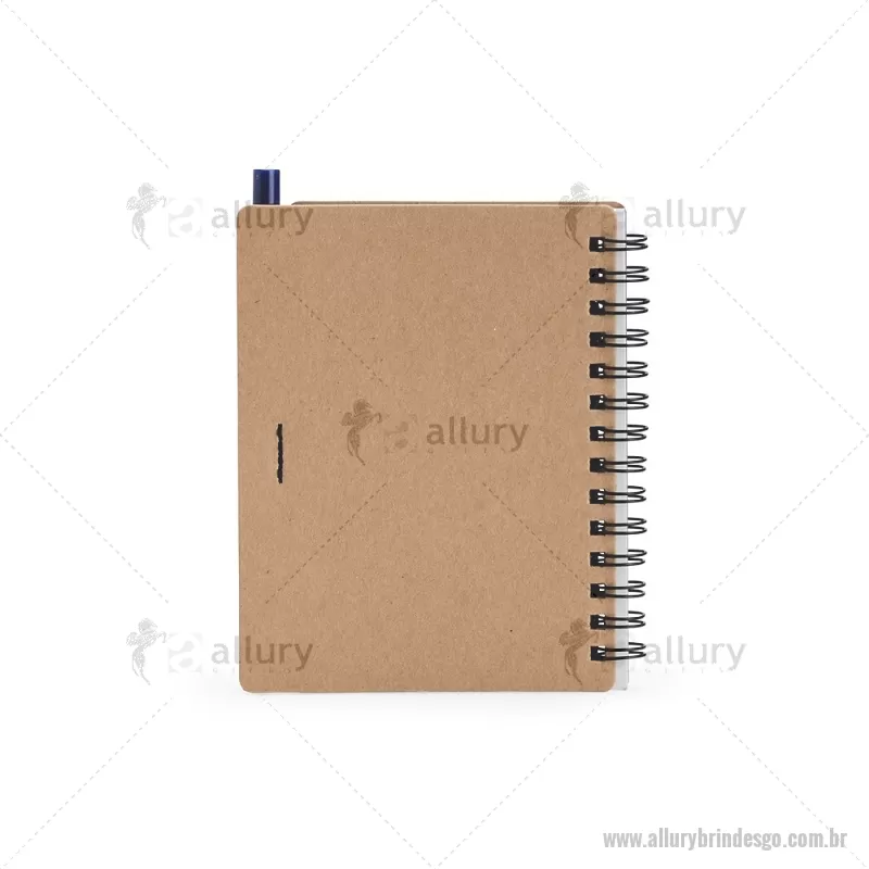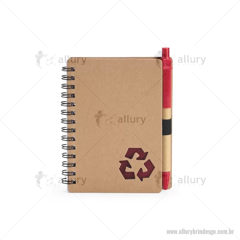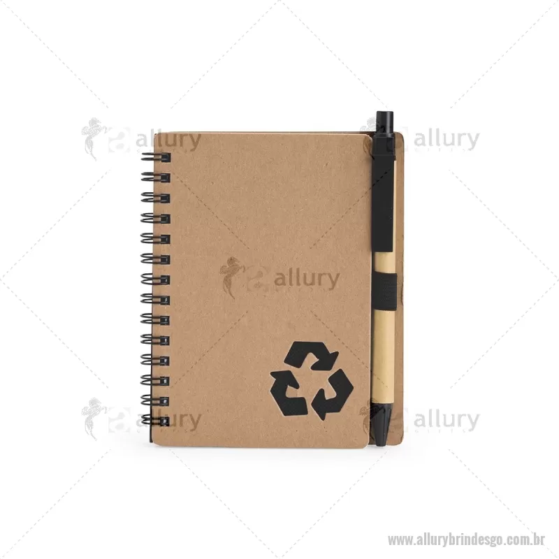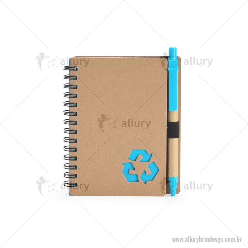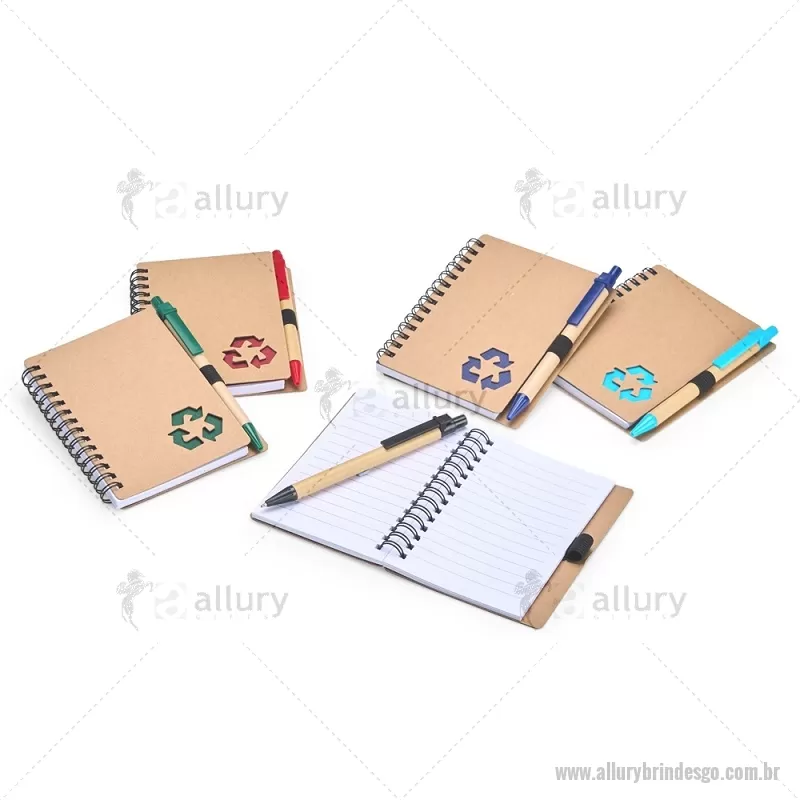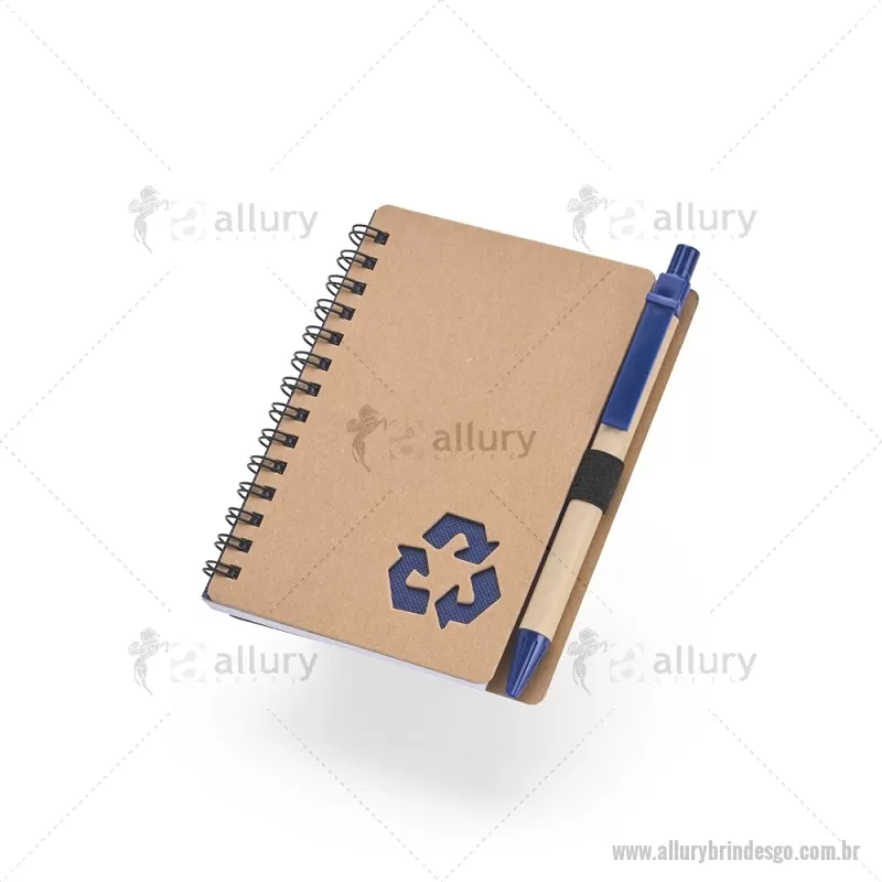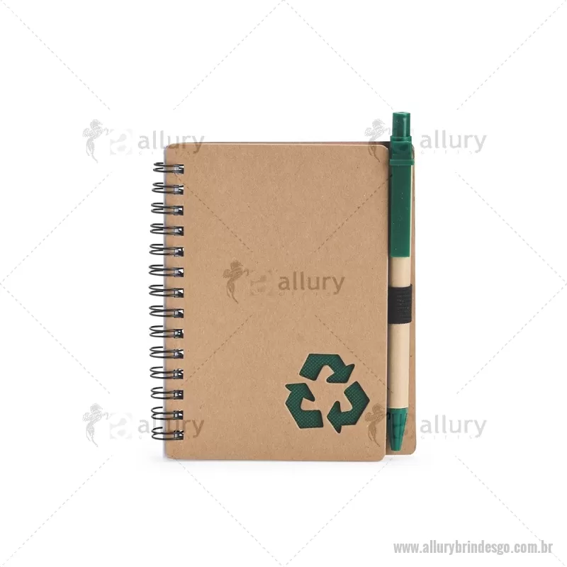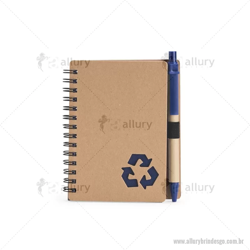 Caderno Ecológico com Caneta Descrição: Este caderno é uma ótima opção para fazer anotações sem abrir mão da sustentabilidade. Com capa produzida em papelão com detalhe vazado que remete ao símbolo da reciclagem, ele conta com encadernação Wire-O e aproximadamente 70 folhas brancas pautadas, trazendo muitas possibilidades para realizar todos os tipos de anotações durante um dia em movimento. O caderno acompanha uma caneta esferográfica de carga azul de 1,0 mm com corpo em papelão e clip, acionamento em clique e ponteira em plástico. A capa contém um elástico para abrigar a caneta junto ao caderno. Largura : 10,5 cm x Espessura : 1 cm x Comprimento : 13 cm Tamanho total aproximado (CxL): Caneta: 14 cm x 1 cm Peso aproximado (g): 80 - - ALLGOBLC266