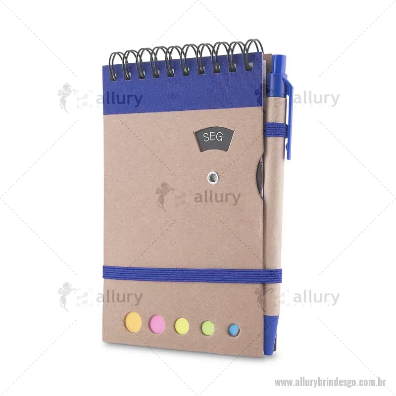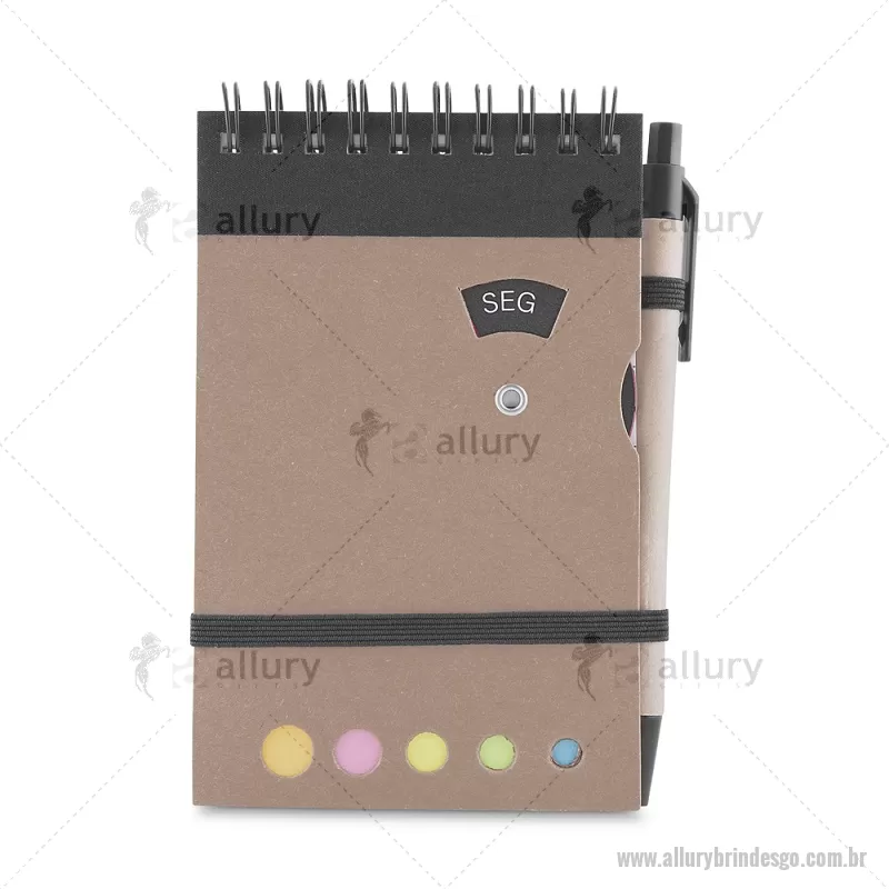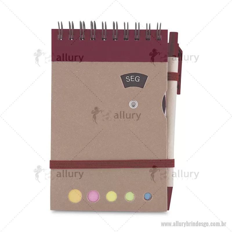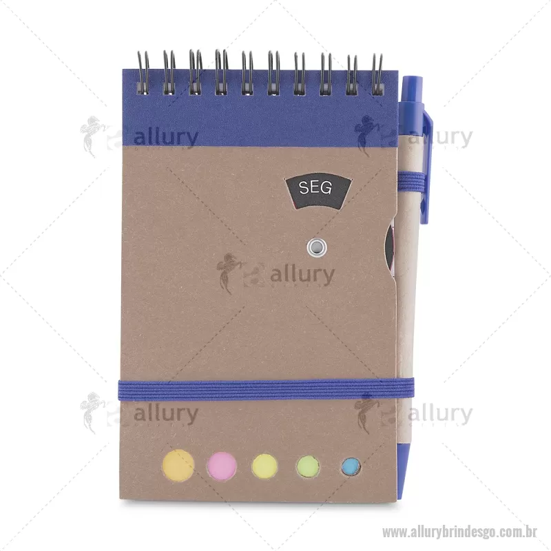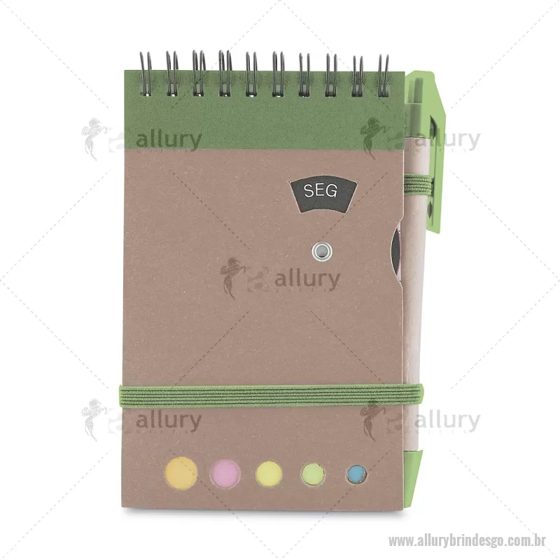 Mini caderno A6 com caneta com capa em papel kraft, com 70 folhas pautadas e blocos adesivos (sticky notes) coloridos. Acompanha disco rotativo na capa com os dias da semana e caneta produzida em papelão reciclado com detalhes em plástico e escrita em azul. Peso do Produto: 0,088kg (Caderno) Peso do Produto: 0,004kg (Caneta) Dimensão Produto: 14,5x9cm (Caderno) Dimensão do Produto: 3,6xø0,9cm (Caneta) - - ALLGOBLC275