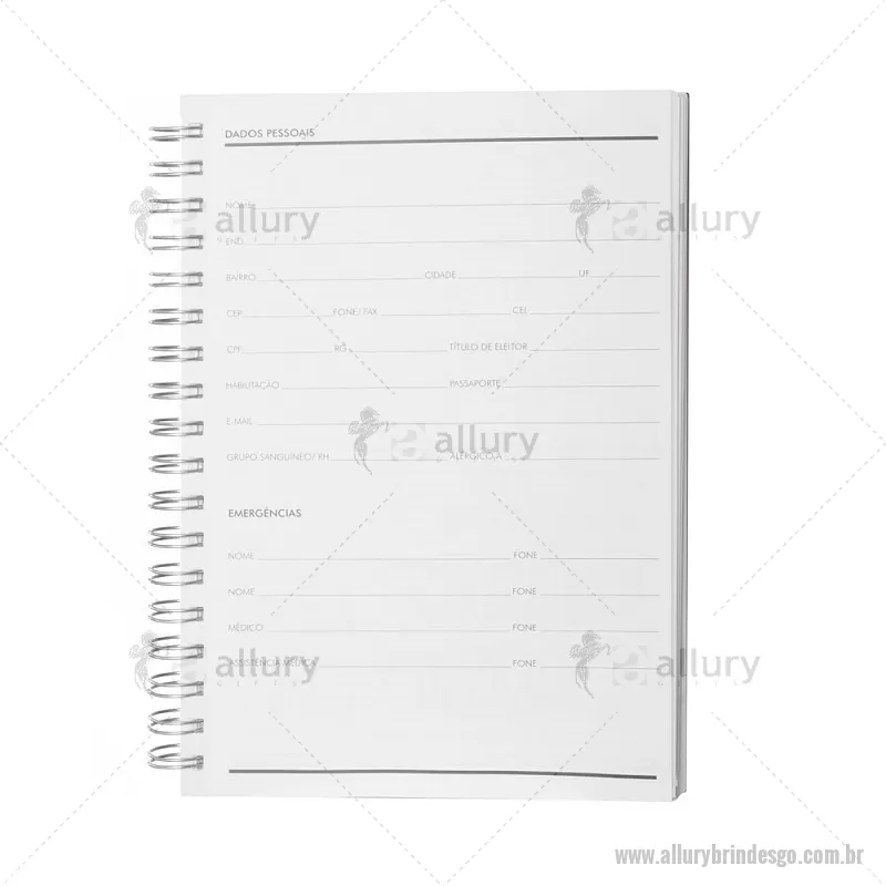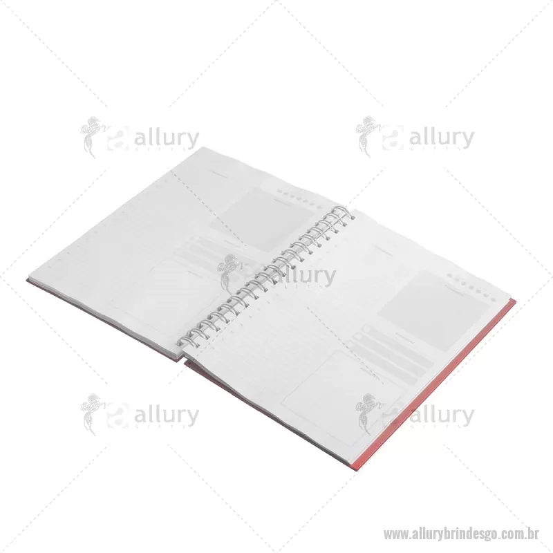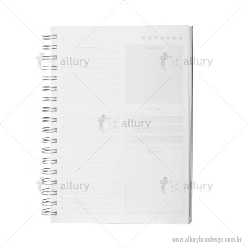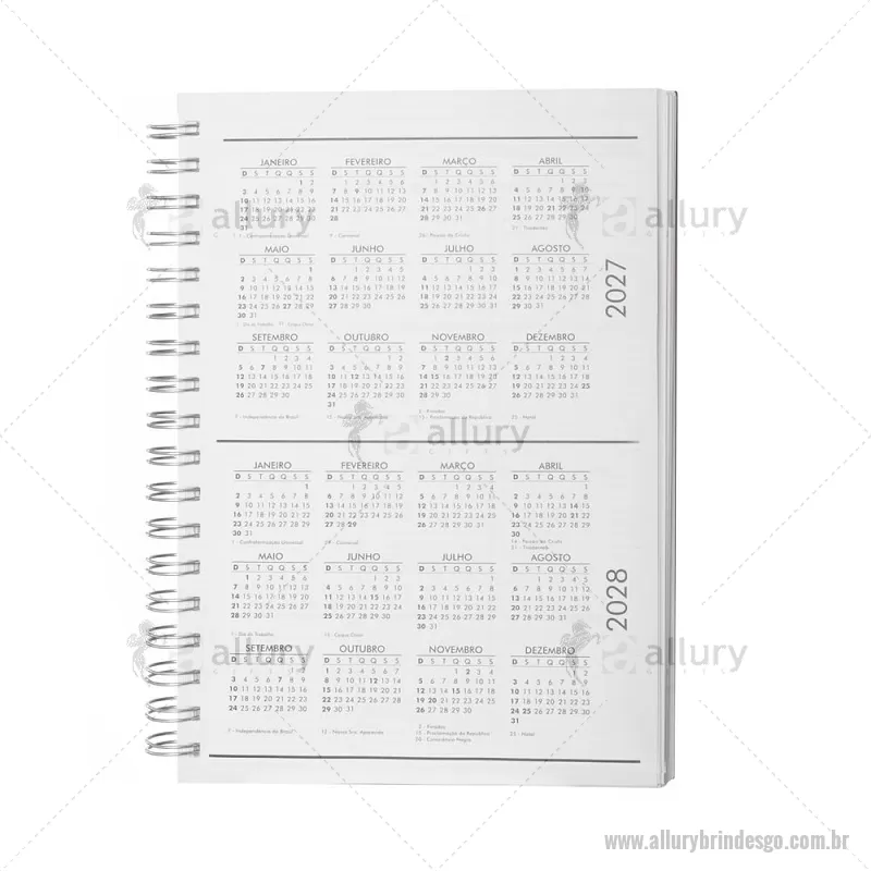 Caderno planner em espiral com capa rígida em Percalux de 2 mm. Possui 90 folhas brancas de 95 g/m² com layout de planner, ideais para organização e controle da rotina. Inclui páginas de dados pessoais, calendários de 2025 a 2028 e espaços para anotações mensais. - - ALLGOCAD034