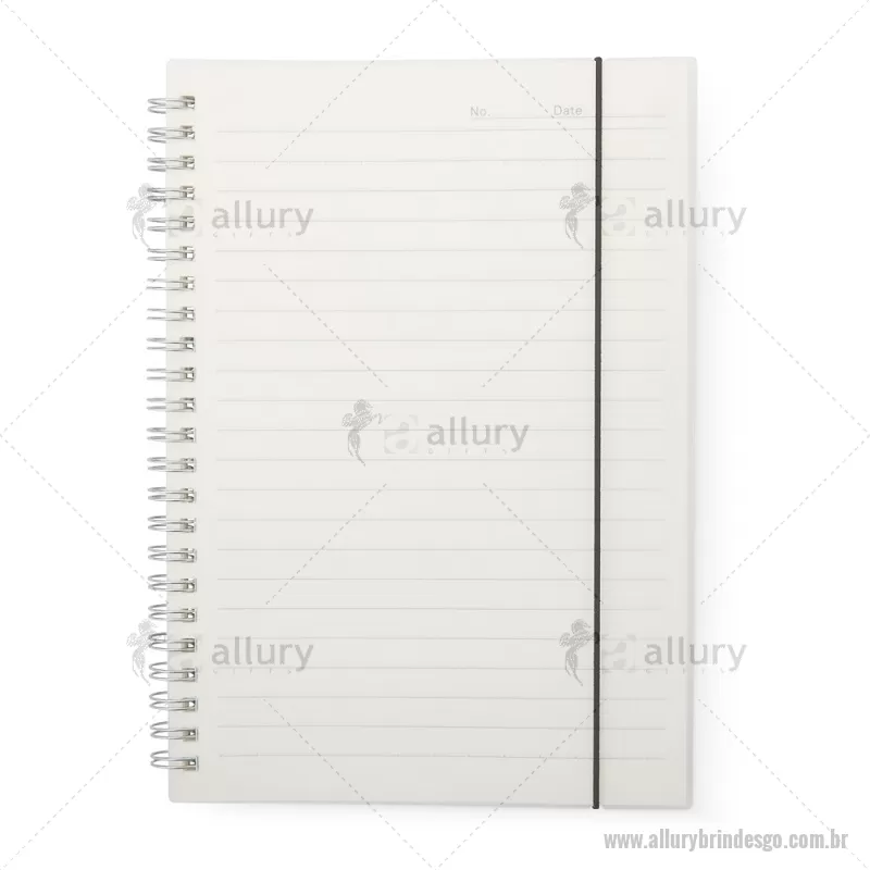 Caderno A5 com capa plástica e elástico para lacre, contém aproximadamente 80 folhas marfim com pauta.