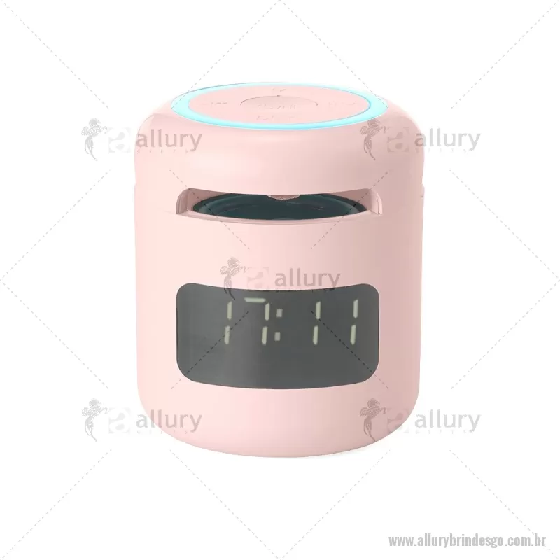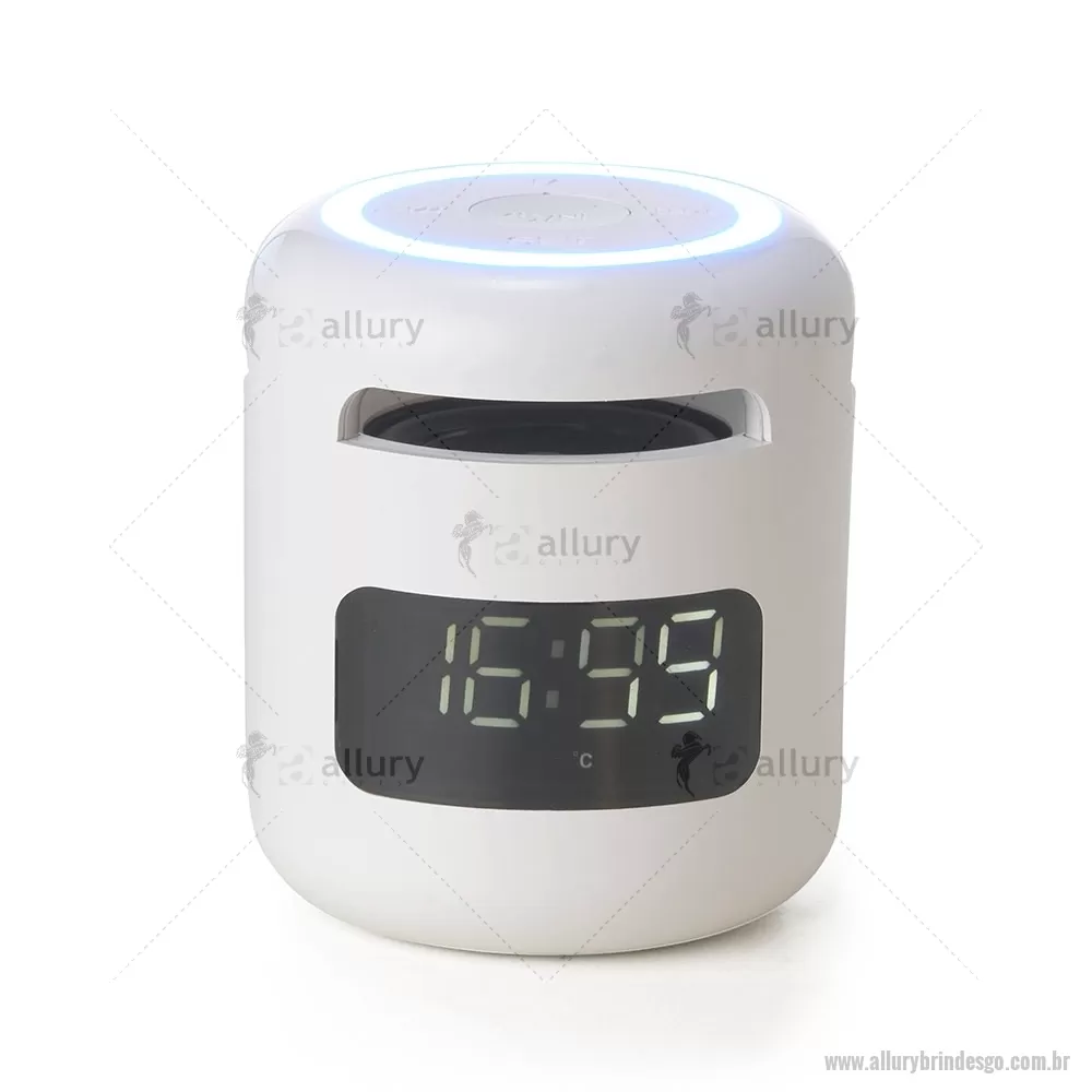 Caixa de som multimídia com relógio despertador. Produzida em plástico e com borrachas antiderrapantes na área inferior, a caixa de som tem bateria de longa duração, display de LED na área frontal, e anel de led brilhante na parte superior. A caixa de som executa nos modos bluetooth, rádio FM, cartão TF-microSD e entrada auxiliar P2. Acompanha cabo USB e manual em inglês e chinês. Medidas: Altura : 9 cm x Largura : 7,7 cm x Circunferência : 23,9 cm Peso aproximado (g): 250 Material: Plástico Duração da Bateria : ± 12 Horas Bluetooth: V 5.0 Frequência de Resposta: 20Hz – 20Kz Potência de entrada: 5V == 1000mA Potência de Saída: 4W THD = 10% Falante: 4Ω 5W Distorção: <0,5% SNR : >85dB Sensibilidade do Radio: 20dB - - ALLGOTEC440