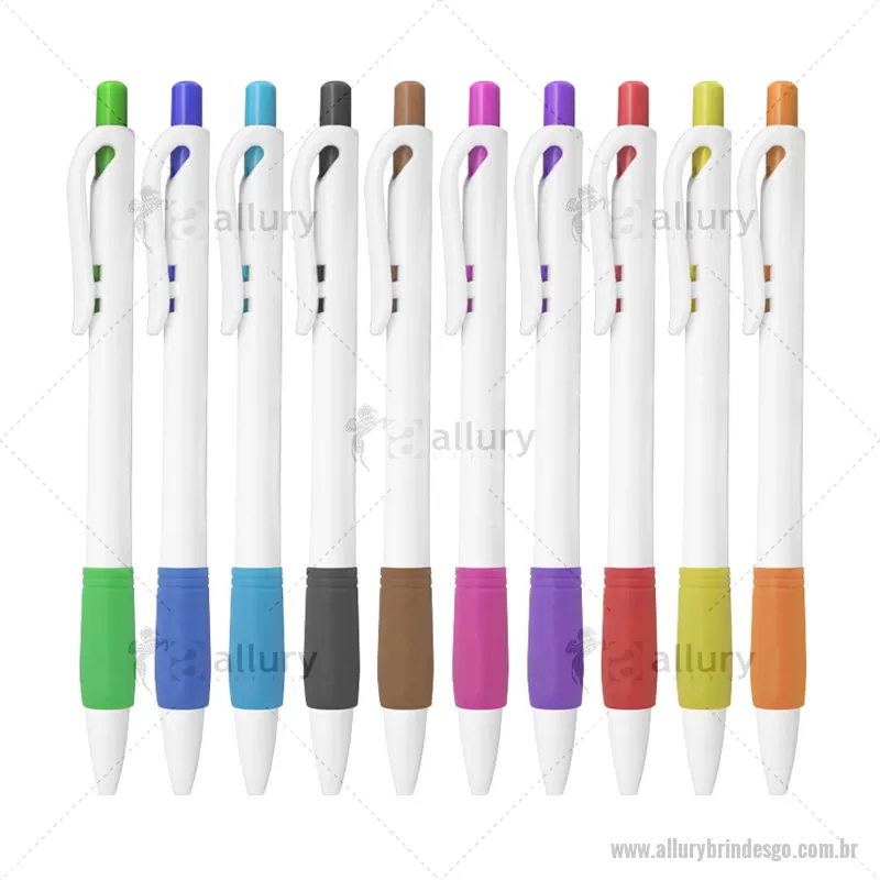 Caneta de plástico. Corpo branco e click colorido. Pegada em borracha da cor do botão acionador. Consultar cores disponíveis. Gravação em Silk Screen. - - ALLGOCPL074