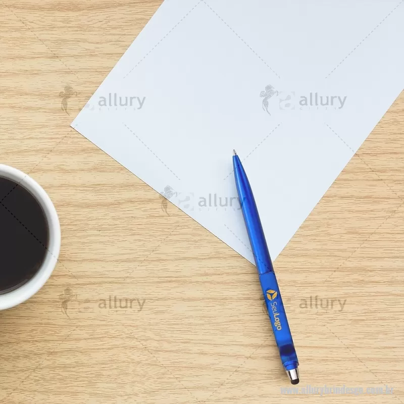 Caneta plástica com suporte para celular e touch screen. Carga esferográfica azul e acionamento por rotação. - - ALLGOCPL201