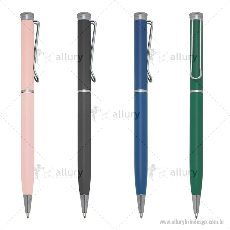 Caneta semimetal com pintura fosca colorida e detalhes em prata. Clip metálico, acionamento por giro e carga esferográfica azul. - - ALLGOCMT210