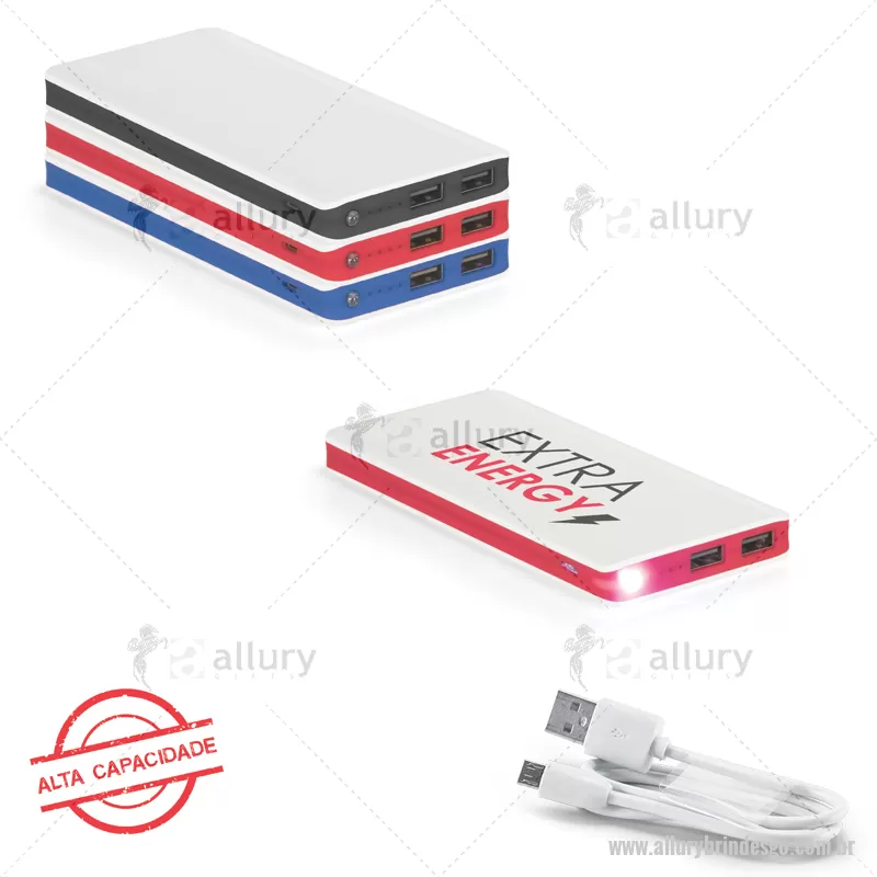 Bateria portátil em ABS com LED. Bateria de lítio com capacidade de 10.000 mAh e tempo de vida ≥ 500 ciclos. Com entrada 5V/1A, saída 5V/1-2.1A e 2 portas USB. Incluso cabo USB/micro USB para carregar a bateria. 150 x 70 x 11 mm - - ALLGOTEC246