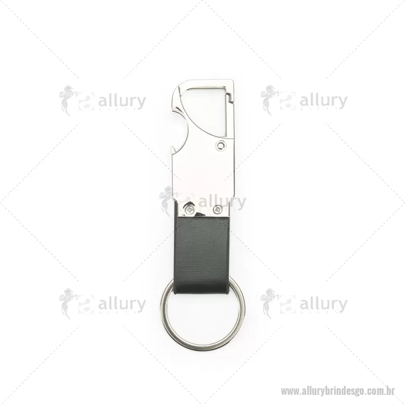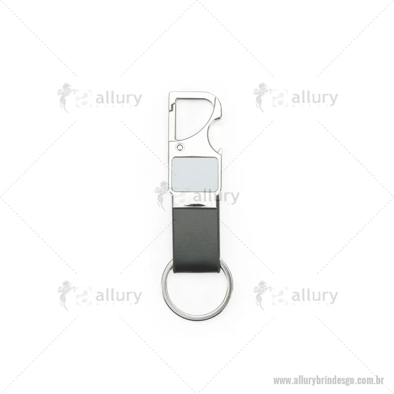 Chaveiro em metal com tira em couro sintético, equipado com mosquetão e função abridor de garrafas. Prático e funcional para o dia a dia. - - ALLGOCHV215