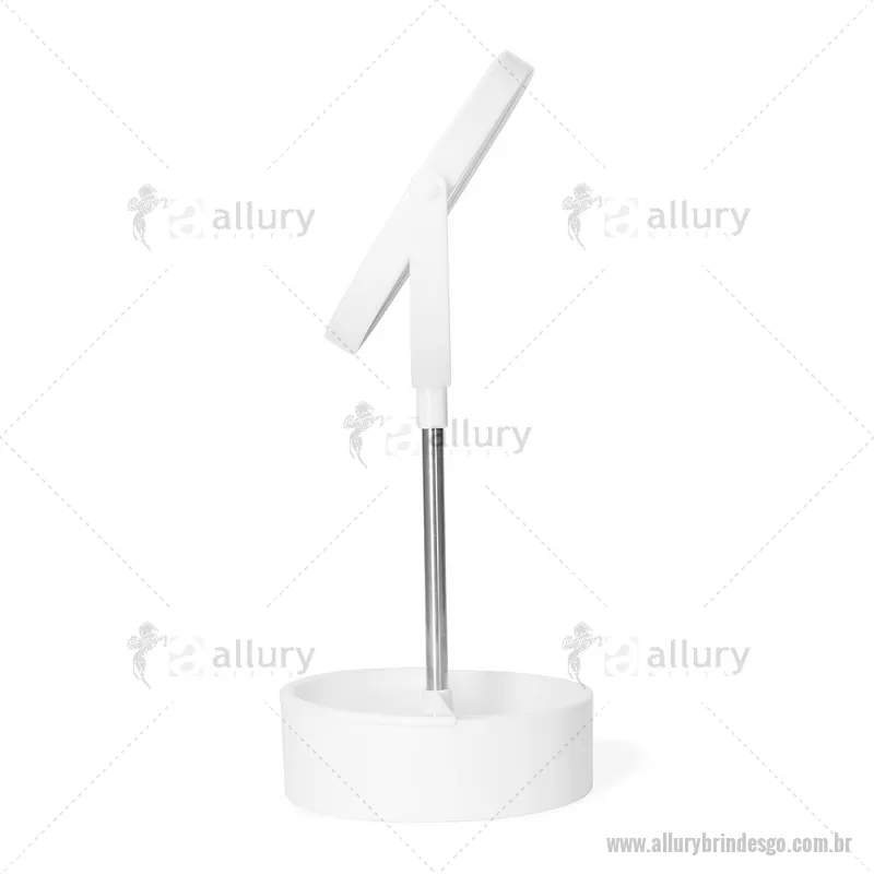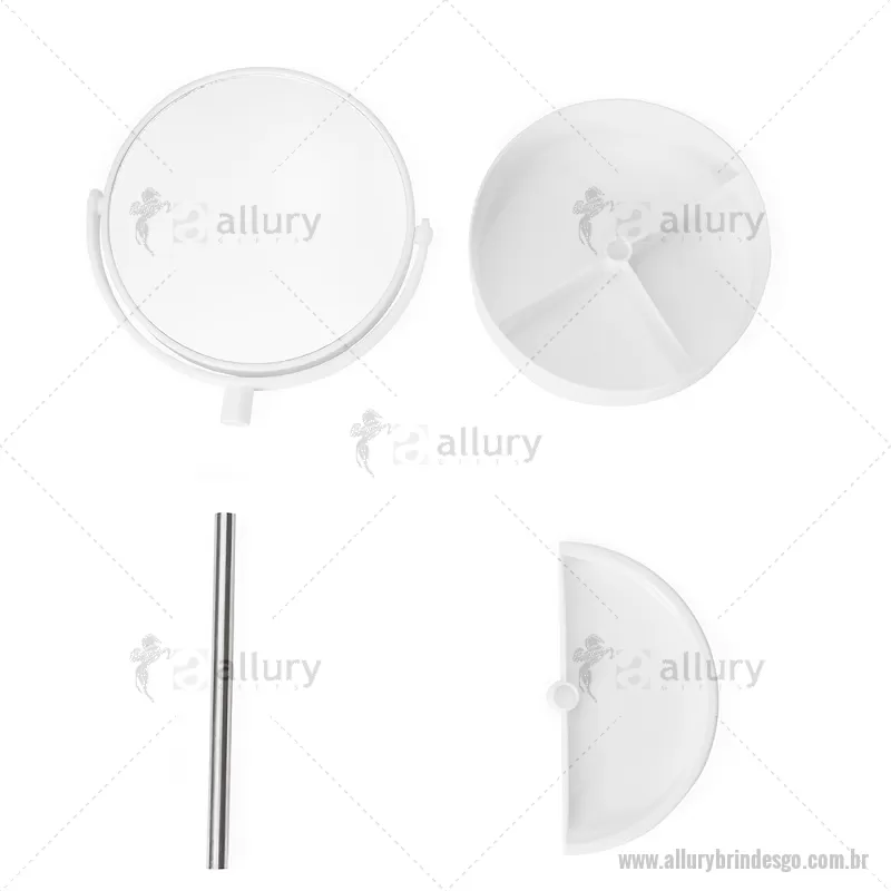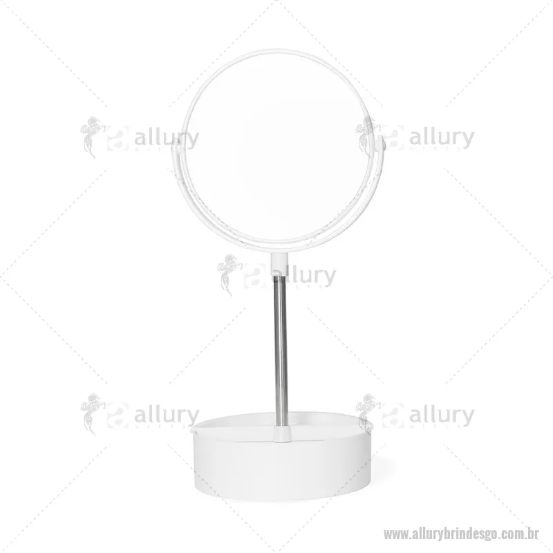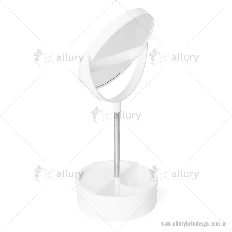 Espelho de Mesa Plástico Descrição: Espelho de mesa dupla face giratório com base e moldura feitas em plástico e pedestal de alumínio. Contém três divisórias na base para organizar de objetos diversos. Altura : 34,5 cm x Largura : 14,5 cm Peso aproximado (g): 275 - - ALLGOFEM121