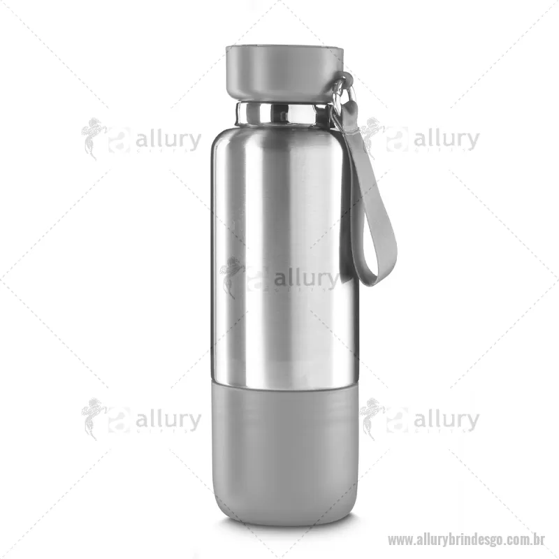 Garrafa térmica em aço inox com parede dupla isolada a vácuo, capacidade de 500ml e cordão tipo mosquetão. Tampa rosqueável, vedada por um anel de silicone. Possui copo adicional rosqueável na parte inferior da garrafa. Parte superior da tampa acompanha um cordão adicional de 68cm para substituição. Permitindo uso do compartimento para pequenos objetos. - - ALLGOGAT114