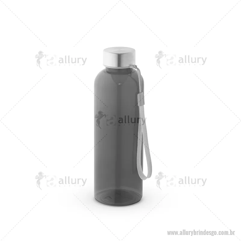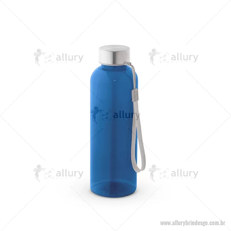 Squeeze em rPET 100% reciclado e tampa em aço inox, com pega em corda para facilitar o transporte. Capacidade até 580 mL.