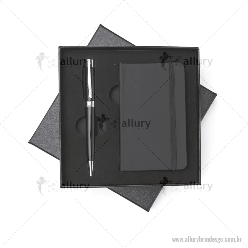Kit executivo 2 peças personalizadas em estojo de papelão com tampa e parte interna revestida de espuma. Contém: caneta metal preta com anel e detalhes em prata, caderneta tipo moleskine em couro sintético com aproximadamente 80 folhas amarelas com pauta. Tamanho total aproximado (CxD): Estojo 17 cm x 17 cm - Caneta 14 cm x 1,6 cm – Caderneta 13 cm x 8 cm. Ótimo brinde para ser utilizado em escritórios. Gravação nas 2 peças silk e laser. - - ALLGOKES045