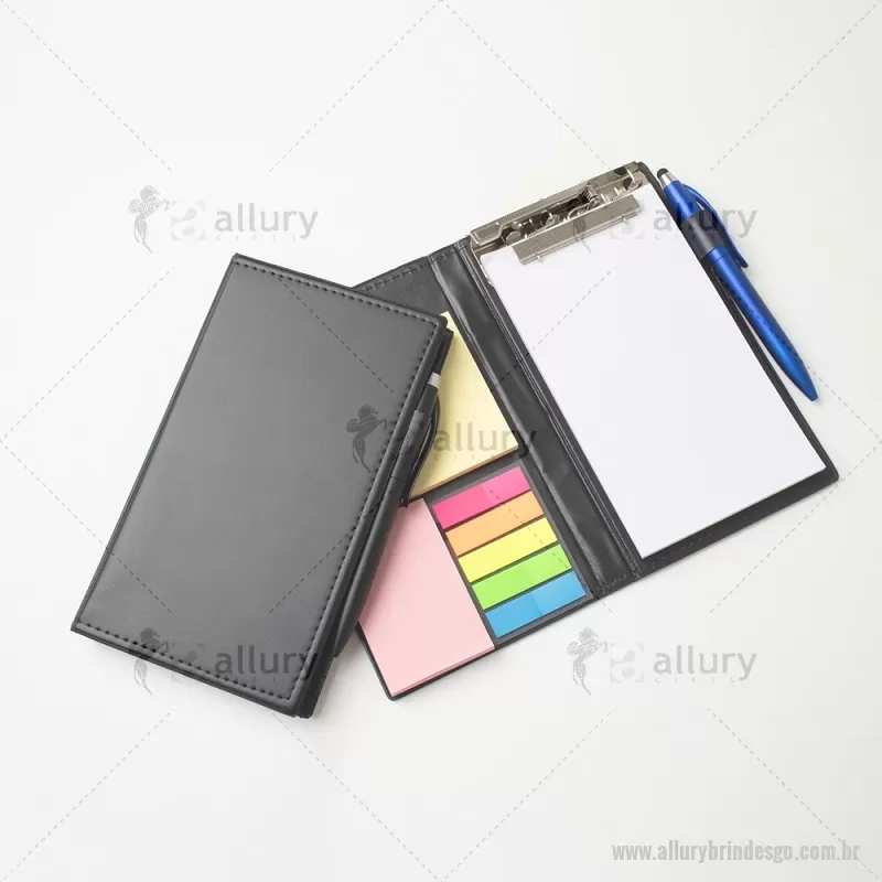 Kit para anotações em couro sintético com autoadesivos e caneta plástica. Contém 3 blocos com aproximadamente 50 folhas, conjunto de 5 marcadores plásticos autoadesivos com aproximadamente 25 folhas e caneta plástica touchscreen com carga esferográfica azul 1.0mm e acionamento por rotação. - - ALLGOBLC223