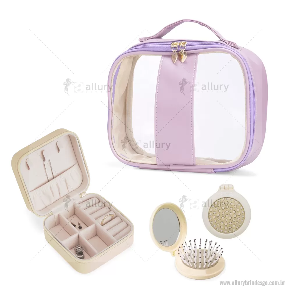 Kit Feminino 3 Peças Contém: 1 Necessaire impermeável de PVC e PU tamanho G, parte interna com revestimento em tecido, possui alça superior para as mãos, e detalhe dourado em formato de coração no zíper. Dimensão: 21 cm x 24,3 cm x 8 cm (NC102) 1 Porta joias de couro sintético com revestimento aveludado. Possui compartimentos internos para anéis, brincos, pulseiras e colares. Dimensão: 9,5 cm x 4,7 cm x 9,5 cm (FEM087) 1 Escova com espelho em material plástico com acabamento leitoso. Dimensão: 6,7 cm x 2,7 cm x 7,6 cm (FEM006C) - - ALLGOFEM104