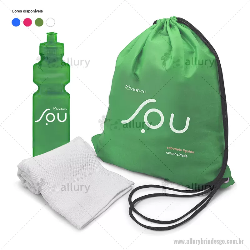 Kit Fitness com 3 peças. Contém: um saco de nylon (MCS001), um squeeze de plástico resistente e uma toalha. Ótima opção de brinde para ações promocionais. - - ALLGOKF002