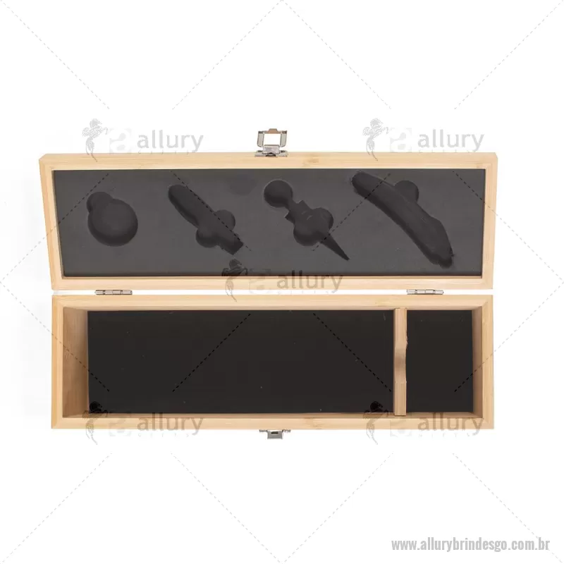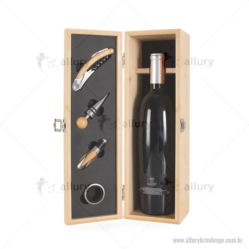 Kit Vinho em bambu com interior em EVA e fecho em inox, suporte para garrafa de vinho de 750 ml (padrão). Contém: saca-rolha de metal com detalhes em bambu e cortador de lacre, anel corta-gotas de metal, bico para servir de metal com tampa em bambu e tampa de metal com detalhe em bambu. Peso do Produto: 0,997kg Dimensão do Produto: 11x36x11cm *Não acompanha garrafa vinho, imagem meramente ilustrativa. - - ALLGOKVI051