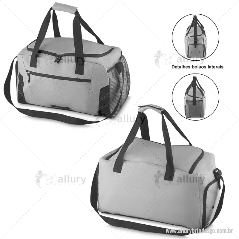 Mala Personalizada Esportiva em Poliester. Bolso com zíper frontal, Um bolso lateral com zíper e Alça de mão. Cinza detalhes e aviamentos pretos. Leve Ideal para levar em passeios, academias e etc. Acompanha plaquinha de metal para gravação. Ótima opção de brinde para ações promocionais. - - ALLGOMC046