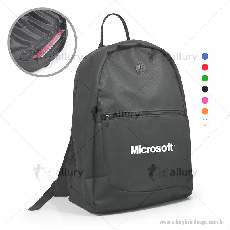 Mochila em poliéster 600 com porta Notebook. Possui bolso frontal externo, alça de mão, passador de fone frontal e zíper. Gravação em Silk Screen. Ótima opção de brindes promocionais para eventos corporativos e campanhas de marketing. - - ALLGOMC014