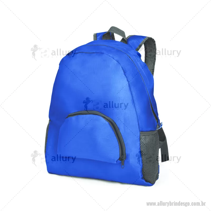 Mochila dobrável confeccionada em nylon 210D ripstop. Com bolso frontal, dois bolsos laterais em tela. Tamanho: 330 x 400 x 120 mm | Dobrada: 195 x 160 x 25 mm
