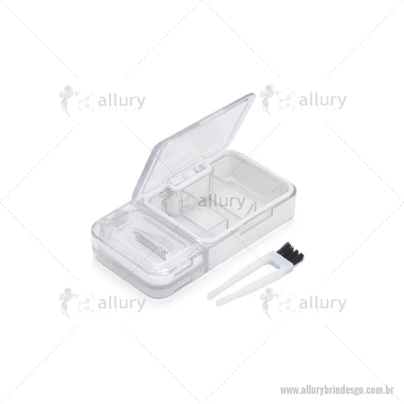 Porta Comprimidos Plástico Descrição: Porta-comprimidos multifuncional em plástico. Possui três divisórias com capacidade de até 10ml cada, além de dois compartimentos especiais: um cortador de comprimidos na parte superior e outro para trituração, localizado na parte inferior. Largura : 6 cm x Espessura : 2,5 cm x Comprimento : 12 cm Peso aproximado (g): 107 - - ALLGOPCP017