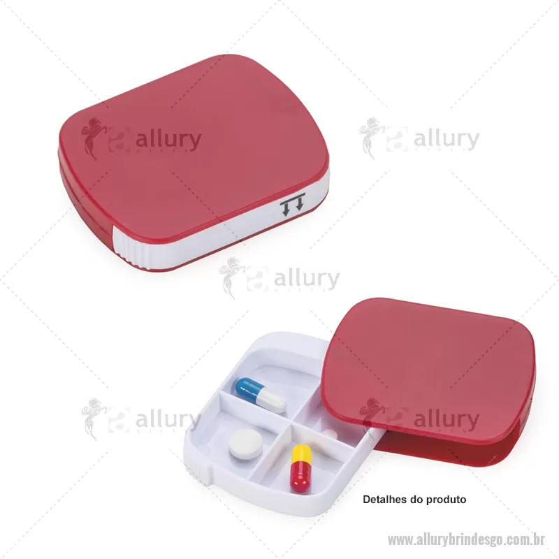 Porta comprimidos personalizado plástico com quatro divisórias. Material plástico vermelho e "bandeja" branca, basta puxar a bandeja para a direita para abri-la. Possui duas setas pretas indicativas de qual é o lado certo de abrir a bandeja(para não correr o risco de abrir o item ao contrário e cair os comprimidos). - - ALLGOPCP010