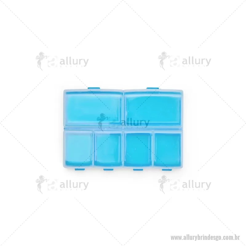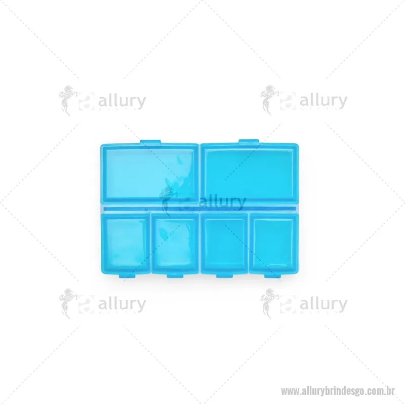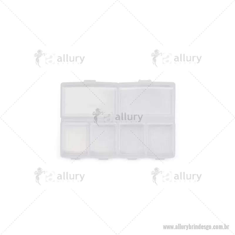 Porta-Comprimidos Plástico Descrição: Porta-comprimidos em plástico com seis compartimentos, dois maiores e outros quatro menores, oferecendo mais possibilidades de organização. Largura : 6,4 cm x Espessura : 1,9 cm x Comprimento : 9,5 cm Peso aproximado (g): 23 - - ALLGOPCP015
