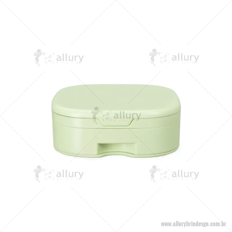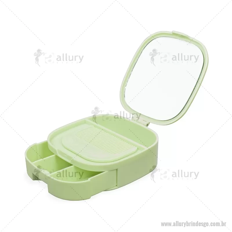 Porta-joias feito em plástico com espelho sem aumento na parte interna da tampa. Possui compartimentos internos de tamanhos variados e uma gaveta com três divisórias. Acompanha um pente compacto para cabelos. Altura : 3,5 cm x Largura : 9,9 cm x Comprimento : 9,9 cm Peso aproximado (g): 133 - - ALLGOFEM120