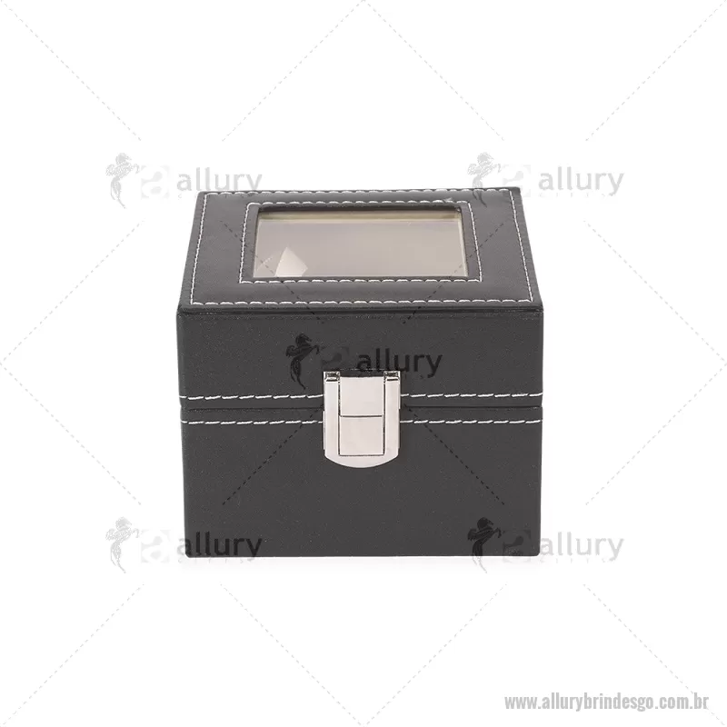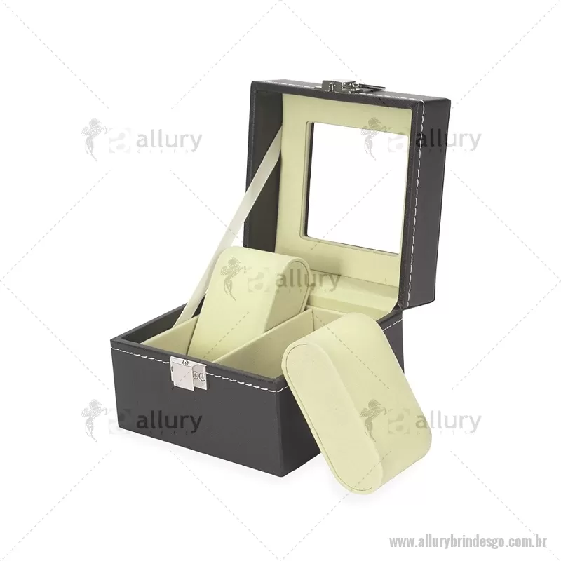 Porta relógios com acabamento externo em couro sintético à base de PVC e interior revestido em veludo macio. Possui duas divisórias com almofadas removíveis para melhor acomodação das peças, tampa com visor em vidro que facilita a visualização e trava de segurança que garante o fechamento adequado do estojo. Ideal para organizar e proteger relógios com elegância. - - ALLGOPREL001