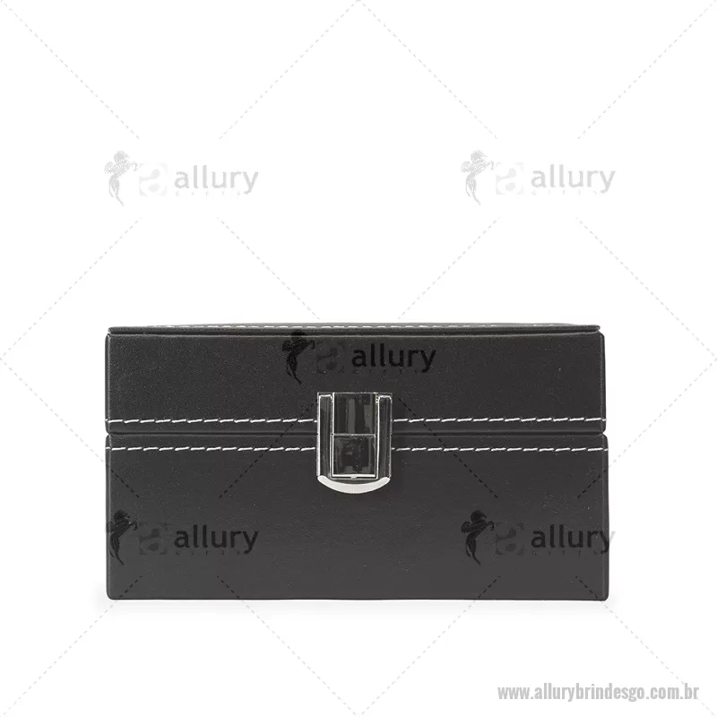 Estojo porta relógios com acabamento externo em couro sintético à base de PVC e interior revestido em veludo macio. Possui duas divisórias com almofadas removíveis para acomodar os relógios, tampa com visor de vidro e fecho com trava de segurança, garantindo proteção e organização com elegância. - - ALLGOPREL002