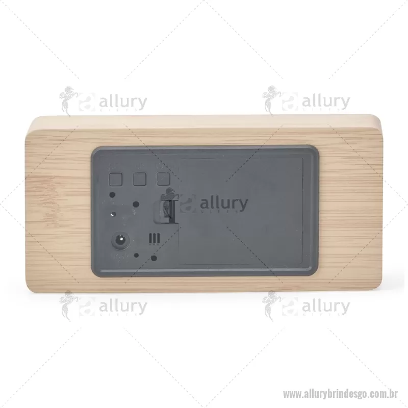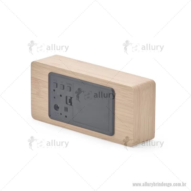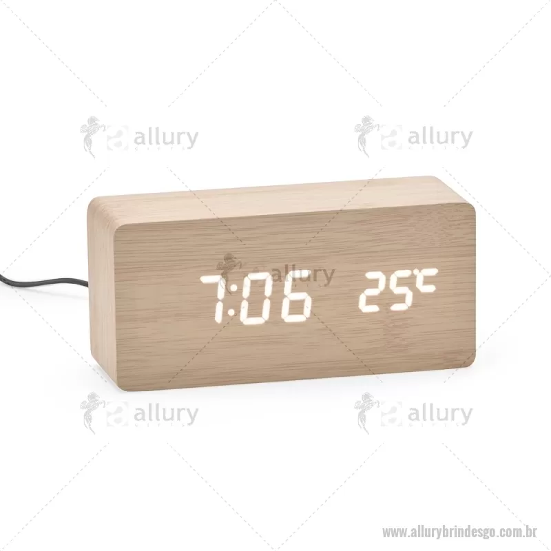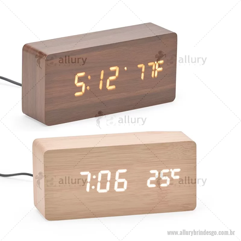 Relógio despertador em madeira com display LED, que combina design elegante e tecnologia moderna. Exibe horas, data e temperatura ambiente, além de permitir a programação de até três alarmes com diferentes configurações. Pode ser alimentado por 4 pilhas AAA (não inclusas) ou por cabo USB DC 5V, que acompanha o produto, oferecendo praticidade para o uso diário. - - ALLGOREL023