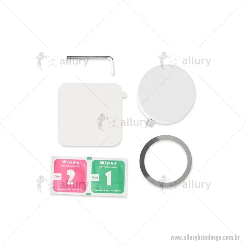 Suporte magnético para smartphones feito em plástico, com ajuste de inclinação e ventosa retrátil acionada por chave seletora para fixação em superfícies lisas. Permite uso do aparelho na vertical ou horizontal por meio do encaixe magnético, compatível com celulares com função magnética ou com anel adaptador. Acompanha dois anéis magnéticos adesivos, um adesivo em policarbonato, kit de limpeza e chave Allen. - - ALLGOTEC536